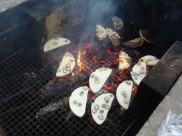 今日の野外料理はいつもの味噌汁に加えて、郷土の味をいただきました。先週Tomoちゃんが講演会に行った智頭町産のもち米と黒豆で出来た豆餅 Takaちゃんの実家長野の郷土菓子「凍り餅」各家でとれたもち米を搗き、切り餅にして、紙にひとつづつ包み、干し柿みたいに紐で軒下に冬中吊るして作るそう。凍り餅を細かく砕いてお湯でふやかして食べます。
