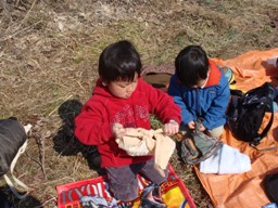 今日は2週間ぶりの森ひろば。とあるキャンプ場で、玉ねぎの皮を使った草木染をしました。13組の親子さん達が集います。2月中旬の寒空のなか、この出席率は凄いな~。皆さんパワフルです。この日は晴れていたけど、風があってちょっと寒い。スタッフNONちゃんは、今日が森ひろばの司会デビュー。彼女はさすが、私よりも手遊びがうまい!子ども達の目がすっと惹き付けられていたよ。炉の火に当たったり、葉っぱや小枝を集めがてら、おさんぽに出掛けながら暖をとります。こういう日は、一箇所に留まっているのが一番寒い。KOちゃんは焼き芋をつくろうと一生懸命!薪をくべます。たまに二人とも広場のほうへお出掛け。KOちゃん、林のほうから剪定された大きな松の枝をしょって来ました。ここはKOちゃんにとって宝の山だね!ご飯とお味噌汁作りと並行して、各家庭から持ち寄った玉ねぎの皮を大鍋で、ぐわらぐわら煮出すと・・・・ホラ、茶色い色が出てきました。少し赤味掛かったその色を見て、紅茶みたいだね、との声。一緒に作るご飯も上手に炊け、食べ始めた頃、自分達で持ち寄った布が染まりました。豆乳で下処理した布は濃い茶色、処理なしの布は薄茶色に染まりました。それをミョウバンのお風呂に浸すと・・・それぞれレンガ色と、からし色になりました。子どもも大人も興味津々!!私はこの色の変わる瞬間が、魔法みたいで何度見ても飽きません。お家で思い思いに絞りを入れてきた布やTシャツ。今日は時間が無くて、残念ながら見せ合うことはできませんでした。では、次回以降に作品を見る楽しみは、お楽しみで取っておこう♪(あっ、でもTAKAは次回はお休みでした・・・)森ひろばが開始してから数ヶ月が経過しました。おんぶだっこだったSYU君が歩いたり、よくねんねしていたRYU君が起きてて周囲を観察してたりと、成長が間近に感じられて嬉しい。今季はあと2回。森ひろばは4月以降も続きますが、今季はいったん3月で終わりです。初代森ひろばのメンバー、優しく頼もしく、そして楽しい方が集まって下さいました。このご縁が、まだまだ繋がっていくことを願います。 (TAKA)