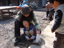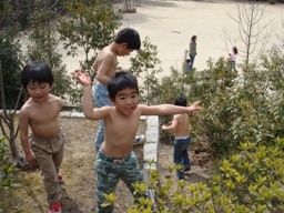 定例会の日。建物の中で大人はブルブル身を縮めながらお話し合い。でも子供達は服を脱いで遊んだよ。今日は広場のある場所でのんびり過ごしました。みんなで鬼ごっこを始めた後、AYU君RYO君SHU君は基地を作り、TAKAが近寄ると来るな~!と追い返される。何だか面白いこと、たくらんでる?MIちゃんSHIちゃんYU君は、細かい土を集め地面にケーキを作っている。小枝がロウソク、デコレーションは葉っぱ。SHIちゃんが指示を出し、MIちゃんは自分で作りたくなり、近くで新しいケーキを作り始める。YU君はSHIちゃんに頼まれるとせっせと葉っぱを運んでいる。そのうちRYO君が脱ぎたい~!と、誇らしげな表情で上半身ハダカに。すると男の子達が、KU,AYU君、GA君、SHU君・・とどんどん脱ぎだした。ZE君は脱ぎたそうで服を胸までめくり上げ、おなかを仲間に見せるけど、やっぱやめる~!とシャツ一枚にしていたね。1学期に息子KUはよくハダカになっていた。NOKちゃんと一緒に頭から土をかぶって遊び、前衛芸術のようになっていたっけ。その時によくKUが歌っていたハダカダンスの時の自作テーマソング“まっちゃっちゃに、なる~♪”を今日ふと思い出したように、GA君と一緒に歌っているのを聞き、私は懐かしいやら、せつないやら・・。あれ、AYU君達がいない・・と思っていたら、広場の隅の木に、保育のお手伝いに来てくれたNANAお姉ちゃんをハンカチで縛り付けている。枝にハンカチで、手首をグルグル・ギュウギュウに。悪ぶるAYU・RYO・SHUコンビ。AYU君は、悪ぶりながらも、こんなに自分が上手に縛れたことが嬉しくて仕方ない様子なのが可愛い。NANAちゃん、子ども達に付き合ってくれてありがとう!!3人組は相当楽しかったのか、一旦ハンカチを解いた後も、もう一度NANAちゃんを縛っていました(笑)今日お手伝いに来てくれた、SHIちゃんと娘さんのHAちゃんも沢山遊んでいって下さいました。HAちゃん、ねっこぼっ子達に混じりたいのに、彼らの仲間意識の強さで、来ないで!と言われてしまう。人の嫌がること・悲しくなることはしないんだよ・・と子ども達には伝えたけど、HAちゃんが来ることに慣れるまでは、防衛本能でしてしまう所があるのだと思う。昔の田舎の子どもが転校生を苛める図みたいだなあ・・なんて思う。昔KUや他の子も通った道ではあるのだけど、されている彼女はつらいよね。HAちゃん、ごめんね。絵本をよみ、帰りの会が終わり、ふと見ると・・・RYO君がAYU君にハンカチの紐でつながれ、四つんばいになってワン!と言っている。おお、今度のハンカチ遊びはそう来たか・・繋がれているRYO君も得意気にしている所が笑ってしまう。今日も一日、楽しかったね。3学期は、あと8日。KUがここで過ごすのもそれ迄。楽しかったり悲しかったり怒りがわいたり、泣けたり、誇らしかったり・・目一杯ここで仲間達との時間を彼が過ごせたらいいなと願います。(TAKA)