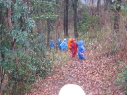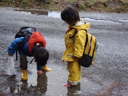 ねっこぼっこの子供達は雨あめダイスキ~!ドボドボ・・・と滝のように雨水が落ちてくる軒下に立って、頭から水をかぶるKu君とShu。今年何度も見たこの光景、本当に嬉しそう。朝の会が終わって小雨の間にお散歩に出かけました。水色、オレンジ、赤、青、黄。。。小さな合羽の列。かわいいな~この姿。湿った落ち葉の道をカラフルなマーブルチョコレートがコロコロ転がってるみたい。水たまりでドロドロ遊びのKu君、Ze君。気持ちよさそう。 晴れた日は、土ぼこりまみれのジーパンや真っ黒な靴下を 洗濯機に入れる前にゴシゴシ洗う母。保育園に通っていた頃は夏場の汗の着替えぐらいしか持って帰ってこなかった。服もそんなに汚れないし破れもしなかった。今の君たちは毎日何セットも着替えが必要。夏は水遊び、雨の日はずぶ濡れ。。。(それでも我が家のGaとShuはねっこぼっ子の中では汚さない方だと思うけど)君たちの汚れた服や泥だらけの靴を手洗いしながら、母は嬉しくなっちゃうんだよ。さてさてお散歩の後は合羽を脱いで着替えます。雨を思いっきり感じ、雨で濡れた服を脱いで裸になり、乾いた着替えを肌にした時のあったかい心地。そういった感触を実体験して、暑い寒い気持ちいいの感覚が身についていくのかな~。今日は0歳児のYunちゃんとKe君がそろって雨降り散歩デビュー。抱っこひもの中でネムネムでしたが、君たちも雨あめダイスキっ子になるのかな。(Ga母)