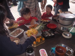 今日はとてもいい天気。朝の会は久しぶりに森の中で。やっぱり一段と気持ちがいい。今日は見学に来てくれた2人のお友達も一緒で、とてもにぎやかでした。今日はやりたいことを最初に決めたので、みんなそれぞれの持ち場へ。私は息子YUTが、一緒に炉をやろうと言ったので、葉っぱを集めに森へ・・・“バオバオ”とゆう葉っぱがあって、燃える時パチパチ花火のような音がする。その葉っぱが気に入ってるYUTは必死になって探していた。そこへNOKちゃんがきて、たくさん落ちてる秘密のトコロへ連れていってあげる。と・・・本当にたくさん落ちてる!!よろこびの声をあげて、夢中に集めて炉に運ぶ、2回ほど往復したら戻ってこない。どうやら炉に火を付け始めたよう。残された私はNOKちゃんに、森で遊ぶ子達に見つからないようにバオバオを集めることを指示され、二人でしばらく 葉っぱで隠れてみたり、木に同化してみたり、勝手にスリルを味わいながら楽しんでいた。久しぶりにNOKちゃんとじっくり色々お話できてうれしかったなぁ。NOKちゃんも皆と家族ごっこを始めたので、炉に戻ると、もう お米は炊けるところだったお手伝いできなくて ごめんなさい。お米の炉はYUTが頑張って火を起したそう。あきらめずに頑張ったんだね。とってもおいしく炊けてたよ。今いるこの仲間で食べる最後の野外料理は、暖かく穏やかな森の雰囲気で、なんだか胸にじぃ~んとくる味だった。 後片付けでは、Ryo君とMiちゃんが、とても微笑ましく食器を洗っていました。幸せが溢れていて 見ている私がほんわか幸せになりました。 ここは本当に心が溢れて幸せな場所だなぁ~。としみじみ思いました。ここに通わせてくれて 本当にありがとう。(akira)