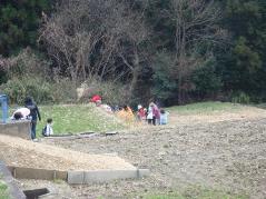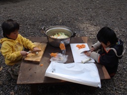 今日は野外調理。前日子供達からリクエストがあったのでお野菜を切るところからスタ-ト。最初はYuzくんとZeが慣れた手つきで切っていく、いつの間にそんなに上手に包丁が使えるようになったのかなぁ。その後「Miwちゃんもやりた~い」と近寄ってきたらYuzくんは快く交代してくれたね。次に近寄ってきたのはGaくん。ダメもとで「やる?」と尋ねると・・・・なんと「うん!」と笑顔。そんな彼の行動に驚きと喜びの私はニヤニヤしながら見守った。他の子供達は炉で火熾しの準備。久しぶりに乾燥した日が続いているから落ち葉も枝も良く燃えるはず!という判断で、いつも利用している角材は使用せず森から燃料を調達しての火熾しをするように子供に促す・・・・が落ち葉がぱ-っと燃えるまでで行動が進まない様子。枝を拾い集めに行くという動作が思いつかないのかな?私が森に入り枝を集めて炉へ持っていったら次は子供達もついて来た。Yunちゃん両手いっぱいに落ち葉を抱えて一生懸命集めてくれる姿が可愛い。そこへまたもやGaくん登場!私と一緒にずっと枝集めをしてくれたね。今日の彼はとても積極的で、またもやびっくりしたけど、ふかふかの落ち葉の森で「これでっかいよ~」「これ長いね~」なんて何気ない会話をしながらGaくんとの時間を楽しませてもらった。炉ではYutくんががんばって火を熾した!!最近の頑張りはすごいねぇ。おかげで美味しいお味噌汁が出来上がったよ。ご飯の炉・・・・SiちゃんMiwちゃんペアで頑張っていたけどなかなか火が育たないね。そこへZeも参戦するもかなりの苦戦。そこへ今度はDaくんが加わりたい様子で炉へ近寄ると・・・Zeに意地悪され仲間に入れてもらえずお母さんに泣きついた。(ごめんね) その様子を見ていたスタッフのNonちゃんが驚いて話してくれた。Daくんは今までマイペ-スで過ごしてきたから、周りの子供達が何をしていても「我が道を行く」って感じだった。なのに今はみんなの仲間に入りたくて近寄って行った、そして仲間に入れなかったことが悲しくて泣いている。これはDaくんの大きな大きな成長!!その瞬間を見逃さなかったNonちゃん いつもそうやって子供達を見守ってくれてありがとう。今日もどうにかご飯も炊き上がり、美味しいお昼ご飯をいただけました。ごちそうさまでした。 そういえば朝の会で 卒園式で歌う唄の練習をみんなでしたね。「みんな一緒に~♪」ともちゃんがお手本に歌ってくれた歌詞を聴きながら、私は練習どころではなく実は涙がウルウルしてました。Gaくんの卒園・KurくんMiwちゃんの退園を思うとなんだかとっても切なくて、このメンバ-で過ごせる日にカウントダウンが始まってもう両手で数えられるようになってしまって、本当に本当に胸が熱くなってくるよ。(Ze母)