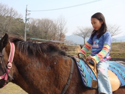 いつも笹のえさをあげているお馬さん。なんと今日は背中に乗せてもらったよ。怖がっていた小さな子も、大きい子が乗っているのを見て安心したのか全員乗れました。 私乗ったことあるから大丈夫よ。 ちょっと緊張、でも嬉しいな。 お馬さんて実はやさしーんだー。 うーん、高いトコの眺めサイコー! エヘヘ、僕カッコいいでしょ。 風がなびくぜぇー! だんだんお馬さんに慣れてきたよ。 妹よ、私の勇姿を見てなさーい。 お母さん、僕乗れたんだよ。 こっち向いて~。やーだよー。 私なんて手を振って余裕だわよ。 僕、緊張。おじさんのご好意で全員が乗った後は触れ合いタイム!みんな最高の笑顔をしていたね。おじさん、本当にありがとうございました。