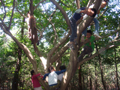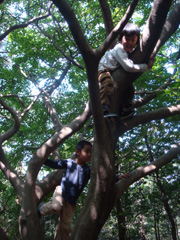 夏休み前の厳しい暑さも一段落し、今日はとても清々しい日。久しぶりの保育当番で少しボーッとしていたのか、気がつけば子供達はグングン森の中へ~!待って~、と、私もスタート。「keちゃん見てー」と声が聞こえ、MAちゃんが木に登り楽しそうにしてます。続いて年長のAYくん、年中のRYくんも登ります。今日皆が登った木は【木登りの木】という名前が付いているだけあって、四人くらい一緒に登っちゃえます。年少さんはまだ高くはのぼれなかったけど下の方で楽しそうに木登り遊び。子供って本当に木登りが上手!!そして大好き。木登りの木の周りでお弁当を食べ、また木登り。の~んびり木登りを満喫した1日でした。 (ke)