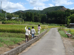 今日は森のようちえんの説明会。小さなお友達がたくさん遊びに来てくれました。森のようちえんってどんなところ?子どもの身長よりゆうゆうと背の高い草むらを、お母さんと手をつなぎ、小さな足で草をかき分け踏みしめる。いざ出発!田んぼには秋の実り。背が伸び、だんだんと首を垂れる稲の横で、バッタやカエル、トンポなど生きものをキラキラした目で追いかけていました。小川をのぞいてみたり。里芋の葉っぱ 大きいな~。ケイトウのフワフワ くすぐったい。あっちにフラフラこっちにフラフラ。お天気が良かったので道中残暑厳しく、ちょっとした木陰がありがたい。涼しい風に思わず顔がほころびます。がんばって最後は坂を上ったら、ようちえんのお兄ちゃんお姉ちゃんがお味噌汁を作って迎えてくれました。外でみんなでいただく味噌汁。大鍋にいろんな家庭の野菜が混ざった味。よく歩いた体にしみわたる。。ようちえん児たちも小さい子を気にしながらもマイペースに走り回っていました。見学の皆さん、今日は暑い中ありがとうございました。またお会いできたら嬉しいです