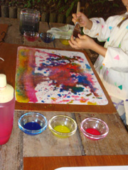 今日はくもり。もうすぐ雨が降りそうだけど・・・。みんなに「どこにいきたい??」と聞くと、「どこもいかな~い、ここであそぶ~~。」とのこと。じゃあ今日はゆっくりと、ここであそぼうか~。おままごとのおみせやさんを広げて遊ぶAYUくん、RYO。「おまんじゅうと、たまごをくださいな。」DAくんと、YUちゃんと、どんぐりや、葉っぱのおかねをもってお買い物。あっちの方では、ZEくん、SIちゃんが羊毛をカーダーにかけながら、家族ごっこ。シラ~~っとした顔をしているから、近くにいたSAKAさんに聞くと、「いま、夫婦げんか中らしいよ~~」だって。かわいいね。SYUくんや、KANAくんも、おみせやさんに途中から交ざったり、走り回ったり、みんな好きなことをして遊びました。そして、今日はSIちゃんの誕生日会。本当の誕生日は夏休みに迎えたけれど、今日はみんなでお祝いです。みんな、お花や、木の実を見つけよう!!そばにいたネコちゃんに夢中になっちゃった子もいたけれど、ドングリや、モミジバフウ、ほかにも、赤や、白のお花、そして、赤くなった葉っぱもみつけました。もうすぐそこまで秋がきているんだな~。そして、SIちゃんのお母さんから、生まれたときのお話をアルバムを見せてもらいながら聞かせてもらいました。お父さんや、お母さん、お姉ちゃんからとっても愛されて生まれてきたんだね。道端に落ちているものの中から、とっても素敵な宝物を見つけるのが上手なSIちゃん。家族ごっこでは、いつもおかあさん。そのお母さん役がとっても良く似合っているSIちゃん。本当におめでとう♪(NON)