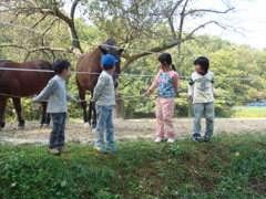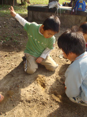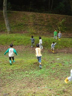 今日も気持ちよく、きれいな秋晴れの日。みんな、どこへ行く~~?「さるすべり~~」「うま~~」に分かれました。でも、MITくん。「こうもりのみちがいい~~。」と。でも、誰も分からない。AYUくん、聞いてくれるけど、勢いがよくて、MITくん、しくしく泣き出してしまいました。じゃあ、MITくん、TANAさんと、コウモリの道を探してきてね。そして、見つけたらみんなにも教えてね。あとのみんなは、二手に分かれました。さるすべりの上で、気持ちよく寝ているAMEちゃん。KANAくんも、とっても楽しそう。RYOと、SYUくんは、落ち葉の滑り台を思いっきり走り抜けていました。馬の方では、広場に出ていた馬に葉っぱをたくさんあげた後、YUZ,NOK,AYU、ZEは、忍者ごっこが始まりました。勢いのいいAYUに言われると、前はすす~~っと違う場所に移動していたZE君。でも、今日は、ちょっと様子が違います。勢いがよくても、口をへの字に曲げながらも、キツツキ組の3人組についていきます。キツツキ組の忍者は、「にんぽう、かくれみの術~~!!」「NONは悪者だから、かくれろ~~!!」などなど、今日名前を付けた「にんじゃの森」の、杉の木の林の中で身を隠しながら、走り回り、にんぽうの修業をしていました。忍者の修業をして、お腹がすいてきたね。そろそろご飯にしようか。みんなのお弁当、おいしそうだね~。みんなで交換しながら、おいし~いお弁当タイムになりました。お弁当が終わった後、さっきはNONは、悪者になったけれど、私も入りたいな~。「なかまに入れて!」とお願いしてみると、みんなニヤニヤしながら、「修行するならいいよ~。」とお許しが出ました。やったね♪みんなに忍者の森まで連れてってもらって、一緒に修業をしました。NOKちゃんと、AYUくんは、先生です。AYUくんは、「NONちゃん!ちゃんとならんで!!」すっかり、先生になりきっています。NOKちゃん先生が説明を始めました。そのうち、さるすべりから帰ってきたSYUくんと、RYOも、仲間入りして、一緒に走り回りました。でも、なかなかハードな修行。小川が流れているところを「さあ、わたって!」と、ぴょ~んと飛び越えるAYUくん。でも、まだまだ難しい子もいたりして、どうするのかな?と見ていると、NOKちゃんが、自分で小川に足を突っ込んで、「こうやって、失敗してもいいから、おいで」と、呼びかけています。RYOも、ZEも、SYUも、それを見て、こわごわと、チャレンジ。おもしろいなぁ~。神社の階段の手すりで遊ばせてもらったから、みんなで神社の神様にごあいさつしようね。みんなも、手を合わせて、小さい声で何やらつぶやいていました。いっぱい遊んだあと、そろそろ、帰りの会の時間だなぁ…。こんなに遊びこんでいる中、とっても言い出しにくいけれど。「もうそろそろ、帰りの会の時間だよ」みんなは予想通り、「え~~~!!!」みんなはまた、かくれみの術を使って隠れてしました。こんなにも楽しいんだもん。無理ないよね~~。隠れたみんなを探していると、水飲み場で水を飲んでいました。みんなは、「NONちゃん、先に行ってて。ぼくたち、あとから行くから。」とのこと。うう~~~ん・・・。本当に来るのかなぁ?でも、きっと来るって、信じてみよう。「じゃあ、この場は、キツツキ組さんに任せたよ。みんなを連れてきてね。」と、そこから離れてみました。少し進んでみるけれど、みんなは楽しそうにしていて、来る気配もない。…もう一度、戻ってみようかな?でも、任せたから、行っちゃだめだよね。自分に言い聞かせながら少しづつ進んでいくと、YUZくんと、RYOが、走ってきました。やった~~♪でも、そのあとは誰もいない。「あとのみんなは??」と聞くと、「まだあそんでるよ」とのこと。RYOが、みんなを呼んでくる!と引き返しはしたけれど、なかなかこない。信じてはいけなったのかなぁ?もう少し強く誘えばみんな来てくれたかも…。などと、いろいろ思いながら絵本の用意をしていたら、みんな、来ました来ました♪やった~~♪やった~~♪戻ってきたみんなも、なんだかちょっと、自慢げです。「ぼくたち、ちゃんともどってきたでしょ?約束守ったでしょ??」うん、うん。どうも、ありがとう。疑っちゃって、ごめんね。さるすべりで遊んでいた、AMEちゃんも、KANAくんも。コウモリの道は見つけられなかったけれど、MITくんも。みんな、いい笑顔。今日の帰りの会では、SYUくんがマッチ当番。でも、NOKちゃんに、「やって~~」とマッチを差し出してお願いをしました。NOKちゃんは、リス組の時、私の不注意で、やけどをしてしまってからなかなかマッチをつけられなくなってしまいました。でも、どんぐり組のSYU君から頼まれたら「いや」とは言えないらしく、マッチを受け取っていました。何度か試そうとするけれど、きっと怖いんだね。「だいじょうぶ?」と聞くと、「家で練習してるから、きっとできる。」と、力強い返事。がんばって!!・・・・でも、また、「やっぱり無理。AYU, やって~~」と。そうか・・・。NOKちゃん、ごめ