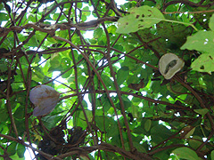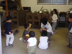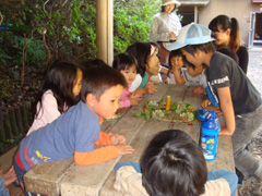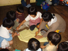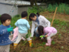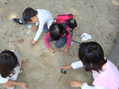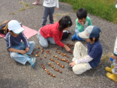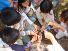 きのうTOMOちゃんが、栗がたくさんなっている場所を見つけてきてくれました。そしてそのまま見に行ってみると、そんなに数はないけれど、みんなが楽しめるくらいは、なんとかありました。この間のクリ遠足は、栗が全然なかったし、歩いていける距離だし・・・というわけで、急遽クリ遠足になりました。イガがまだ青くて、味はどうか…???という感じですが、みんなは、イガから栗を出したくて、「わたしのもとって~~」「ぼくのもとって~~~」と、待ち構えています。みんな自分の持ってきた袋の中に詰めているんだけど、あとでみんなで分けっこだよ。道を通っていく人たちに、「採れる~~?」なんて、あったかい声をかけていただきながら、なんとか、けっこうな量を採ることができました。さあ、みんなのクリを集めて、栗を分けるよ。そして、これは年長さんのお仕事。年長3人で頭を突き合わせて考えています。NONが、「みんなの数分分けてね。」というと、3人は、そろって、頭を傾げています。頭の上にクエスチョンマークが????と出ているみたいです。どうなるかな~~?と、見ていると、「8家族分」と言ったNONの言葉に反応して、YUZは、8個づつ、栗を分けていきます。NOKは、1列にそれを並べていきました。AYUは、栗の数を数えていきます。でも、クリは、80個くらいあったので、10家族分もできました。NONが、「これじゃあ、2家族分、余っちゃうよ~。」というと、YUZは、「もう、めんどくせ~~~」と。NOKは、「わから~~ん。」AYUは、一生懸命考えている様子。キツツキ組さんがやってくれないと、みんな持って帰れないよ。というと、小さい子たちが応援します。「この2家族分は、うしろにつけ足したらどうかな??」とヒントを出したら「あ~~~、そういう意味か~~!!!」と、YUZが納得。他にもたくさん。紆余曲折があったものの、やっと、残った栗を分けることができました。辛抱強く、がんばったキツツキさん、3人組。なんだかとっても頼もしく見えました。これからは秋本番、いろいろなものが楽しく、おいしくなる季節。とっても楽しみです♪(NON)