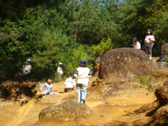久しぶりのさるすべりに着いて早々にお弁当を広げる子を見て、同行した夫がボソボソ「お弁当は何時なの?」お腹が空いたら食べるんだよ。「みんな退屈だから食べるんじゃない?」小さい子はお腹がちょっと満たされると安心するんだって。「ふーん、この年齢だと4次元で生きてるっていうか、時間の感覚が無いんだ。」お弁当が落ち着くと、斜面を走りながら滑り降りる子、お腹ですべる子。登ったり下りたり、単調なように見える遊びの繰り返し。繰り返すって事は、何度もやりたいぐらいの楽しさってことなんだ。「さるすべりってホントよーく遊ぶよね~」って随分前にNorさんが教えてくれたのを覚えているが、今日はまさに遊びこんだ日だった。Nonちゃんの帽子をいたずらっ子達が奪っていった。小さい子や女の子にはとっても優しいYu君が、勇敢に何人もを相手に向っていた。いたずらっ子は帽子をあっちへヒョイ、こっちへヒョイ。斜面だというのにすんごい身軽に走り回る。その少しの隙を狙ってYu君が奪取!小さい子達はどっちの味方でもないけど、じっと見て何かを感じているだろう。その後はハンカチ落とし。大人のReとNonちゃんも入って全員で輪になり嬉しかったな。ルールのある遊び。小さい子にはルールをきちんと理解するのは難しいけど、大きい子が教えてあげながら、みんなで楽しめたよね。鬼になりたい子が多くって、「オレ(私)鬼やってない~」と主張するのが面白かった。笑顔がいっぱい見れました。お次は崖の下から勢いつけてよじ登るのを繰り返し繰り返し・・・Yu君、Noちゃん、Ayu君、Ryo君、上手に登っていく。順番に並んで仲間が登れたり失敗するのを笑顔でワイワイ見ながら待つ姿。2学期になって強まるみんなの絆が表情に表れている感じがしたよ。SIちゃん、もうちょっとというところで残念。でも「Siがんばれー」って後ろから声援が嬉しいね。登るのには失敗しちゃったZe君だったけど、仲間と一緒に遊ぶそれだけで嬉しい笑顔が見れました。崖のぼりには参加しなかったDa君、Shu、Yuちゃんは落ち葉坂を上っては駆け下り・・・の繰り返し。こっちもこっちで夢中になって走っています。「お腹すかないんだー」と言ってお弁当を最後まで食べなかったDa君も、いっぱい走ったから帰る前にはお弁当を食べていました。そして帰りの会の直前までゴロゴロ坂を転がったり駆け下りたり、今日はよーく遊びこんだアクティブな君たちでしたが、絵本の時には「読んだことある~」と文句を言いながらも、静かに聞いていてくれてありがとう。(Re)