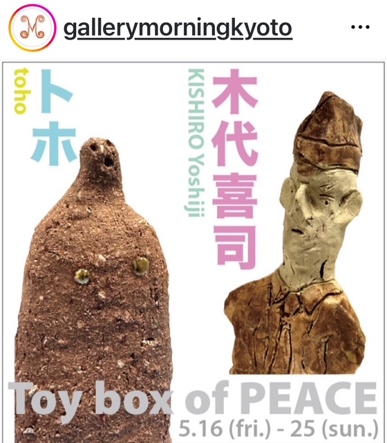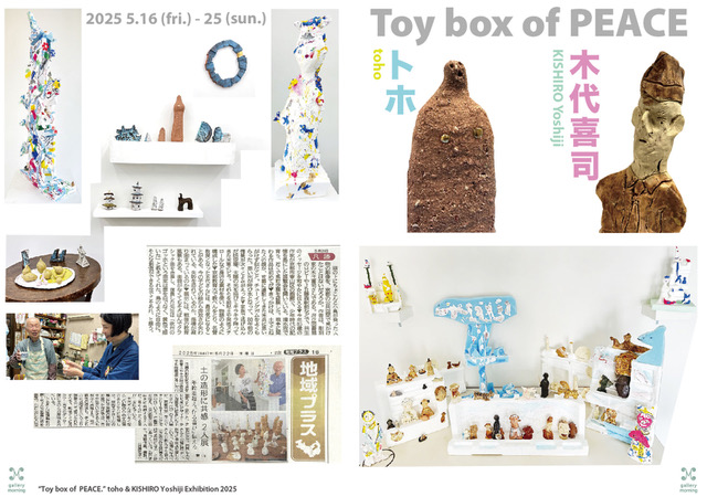Toy box of PEACE 木代喜司 & toho 5/16(金) 〜25(日)木代喜司 KISHIRO Yoshiji <彫刻家> 「戦中。そしてアメリカ兵が進駐してきた京都のあの頃のことを思い起こしながら作りました。」1940年京都生まれ。京都を中心に個展、グループ展多数。トホ toho <陶芸家>「こんな時代になってしまって。平和への願いを込めて作りました。」1969年生まれ。京都市立芸術大学卒業。大阪、東京、京都などで精力的に陶のオブジェを発表。https://gallerymorningkyoto.blogspot.com/2025/04/toy-box-of-peace-toho-515-25.html