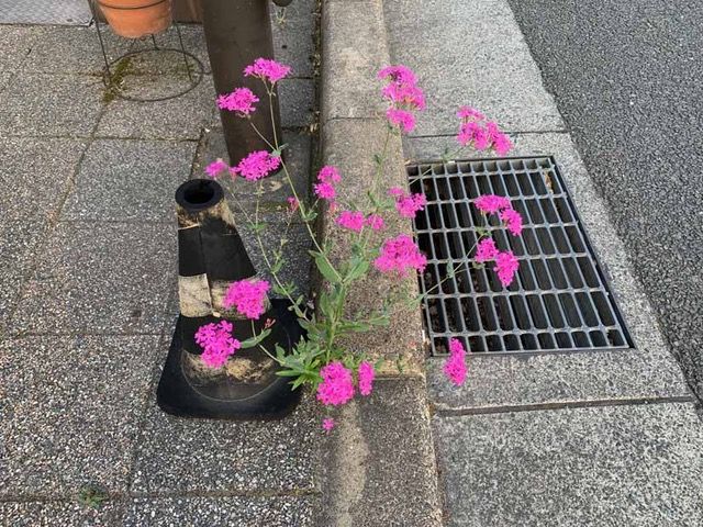 歩道の縁石の空間に。