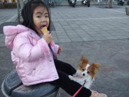 リボンとお散歩に行きました。もーたんはお休みの日は必ずリボンとお散歩に行きます。今日は家族全員で2時間くらい土手をお散歩しました。リボンはずーっともーたんと一緒に走り回ってましたよ。元気だなぁ近くの公園で休憩した時のお二人さん。胡麻アイスを一緒に食べていました。