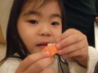 うちはパパが大のお寿司好き。なので、もーたんもよくお寿司屋さんに行きます。よく行くお寿司屋さんが2件あるのですが2件とももーたんのお寿司はこんな感じに握ってくれます。今日もこんな感じに握ってくれました。だいたい2貫分をこんな可愛く握ってくれます。もーたんのお気に入りは「ひらめ」や「かんぱち」。それに肝系も好きです。「あんきも」も好きだし「カワハギ」を肝と一緒に食べたり…。お酒飲みになりそうでしょ(笑)子供っぽく「サーモン」や「ハラス巻き」なんかも好きです。写真はサーモンの握りです。