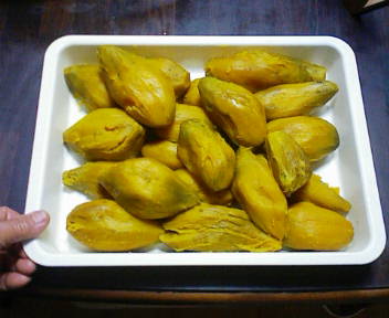 三重県伊勢特産の「キンコ芋」を作りましたと 言っても、出来上がりは「干し芋」です何が違うかと言うと、使う”芋”が「隼人芋」であると言う事ですこれって、八百屋で見ると結構”高価”なんですよ~ 作り方は1、水洗いした隼人芋の皮を、ピーラーで剥きます2、クチナシの実を数個入れて、茹でます---我家では圧力釜を使います3、釜から出し、冷ますと同時に水分を飛ばします こんな状態---いい色でしょう くちなしの実効果が出ています今回使った「芋切り道具」ピアノ線を張って有ります線の張り具合を自由に調整できる所が”ミソ”です後は、日干し乾燥です未だ今日干したばかりですが、美味しそうですよねこんな感じですこの寒さなら、4~5日で出来上がるでしょう でわ~