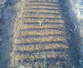 昨日、ネギの植え替え(仮植え)をしました今年も、下仁田と越津中ネギの2種類です今年の越冬はかなり厳しく、苗がギブアップするのではないかと心配したが春になって、その心配も吹き飛びました 越冬時の状態ですそれが今、こんなに立派に育ちました遠方が越津中ネギ、手前は下仁田ネギです越津中ネギは、40~50cmに下仁田ネギは、30~40cm位に伸びました色も大分良くなり、葉の先の方の「枯れ」もすっかりなくなっています苗を抜き、大・中・小の分別します大きな元気のいい苗から順番に植えます、小さいのは”ポイ”ですねこれで、苗に準備は完了です 次に、植え替える場所の畝作りです少し深めに溝を掘ります先ほどの苗を溝に並べます根の部分に藁を敷き、上に土を被せますこの時の土は、藁が風で飛ばない程度の少量でいいです左2畝が下仁田ネギ---200本右1畝が越津中ネギ---100本これで、植え替え(仮植え)完了です次の植え替えは、夏に最終の「定植」をして完了です でわ~