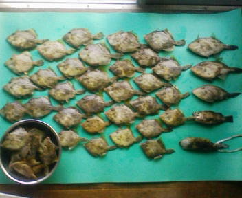 昨日、「ボートでの海釣り」に行ってきましたカワハギの心算だったのだがもう沖の深みに移動したようで先回の水深10mの漁礁では全く反応無しでしたでも、1時間ほど粘ってみたが釣れたのは、23cmのガシ・・・1匹のみ こんな事もあろうかと、キス釣りの餌も用意していたのでキスに変更こちらは未だ岸の近くに居ましたサイズは、秋は育っていますね~最大で・・・21cmしかも殆どが15cm以上2本針仕掛けにこんな事が4回ほど今シーズンのボート釣りは恐らくこれが最後でしょう当日の釣果ですキス・・・46匹雑魚・・・3匹キスは全部三枚おろしにしました今の時期のキスは、脂がのってますね~捌いていると、手が”ねちねち”に・・・天麩羅&フライで戴こうかな数が多いので、一部「干物」にもトライしてみますほなぁ~