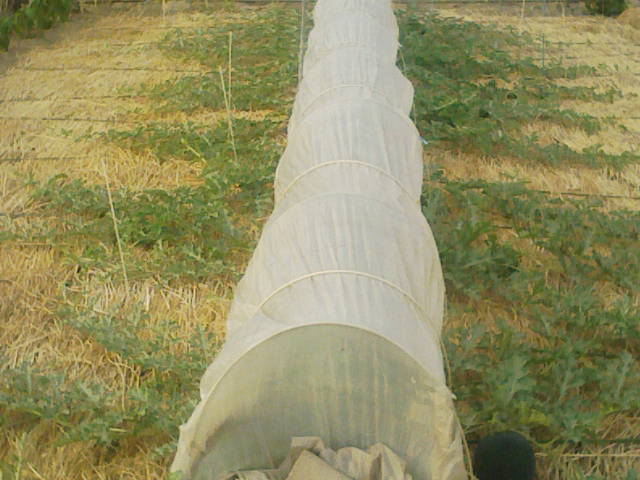 昨日暑い中、西瓜畑に藁を敷きました藁敷き前(10日前の映像)その後蔓が伸び、藁の外にはみ出してきました玉も付き始めました中には、こんなのが(仲良く3姉妹)1本の蔓に、節生り・・・恐らく2個は生理落果するでしょうでも、暫くそのまま様子見します畝左側・・・全て終了畝右側・・・右手前のレタス畝を残し、ほぼ終了藁敷き後全景これで、暫くは大丈夫西瓜畑の全景です鳥除けの為、周囲を海苔網で囲ってます天井は(見えないが)中心の柱から、囲い柱へ放射状に「テグス糸」を張っていますこれで、カラスには万全です残り(レタス畝)が片付けば、完全終了です ほなぁ~