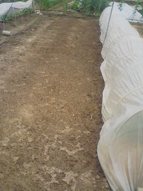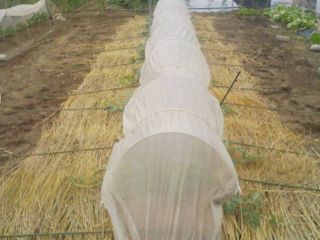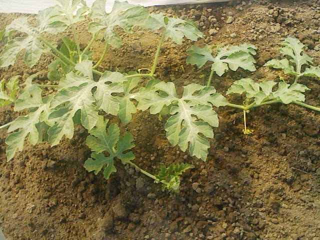 昨日、西瓜に藁敷きをしました西瓜蔓は未だトンネル(右)の中中で窮屈そうにしています左の空き畝、先週施肥・耕運してありますその後均し昨日、藁を敷きました右側も同じ作業を伸びた蔓は外に誘引今後蔓の伸び具合を見ながら、延長今回は・・・ここまで蔓仕立ては、片側2本途中の脇芽は取り除きますもう、果が着き始めましたでも、この果は摘果します葉20枚位以降から、果を着けます ほなぁ~