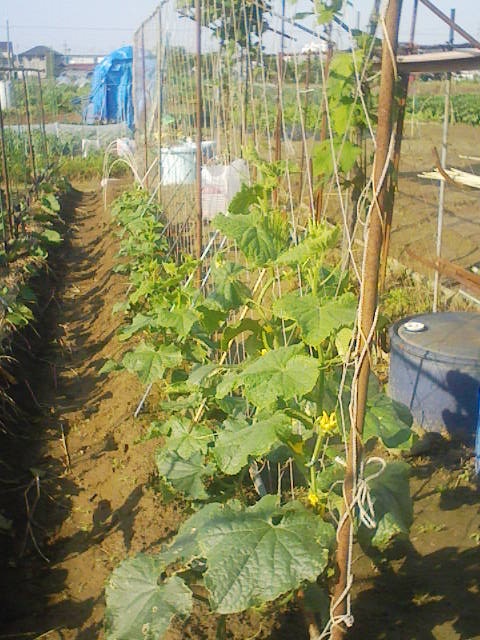 胡瓜が収穫できるようになりました胡瓜畝・・・全部で19本植え付けできるのだが今の所、13本・手前の2本・・・・・買い苗・その奥11本・・・初回自家苗・買い苗・・・2本初生り胡瓜は、樹の成長を妨げるので早めに収穫します・奥の自家苗ぼつぼつ花が咲き始め・空き畝・・・6本分ここには、2番手自家苗を「3本」植えます更に、6月に入ったら種蒔きする3番手苗を3本植える予定これで、いつ頃まで収穫可能かな ほなぁ~
