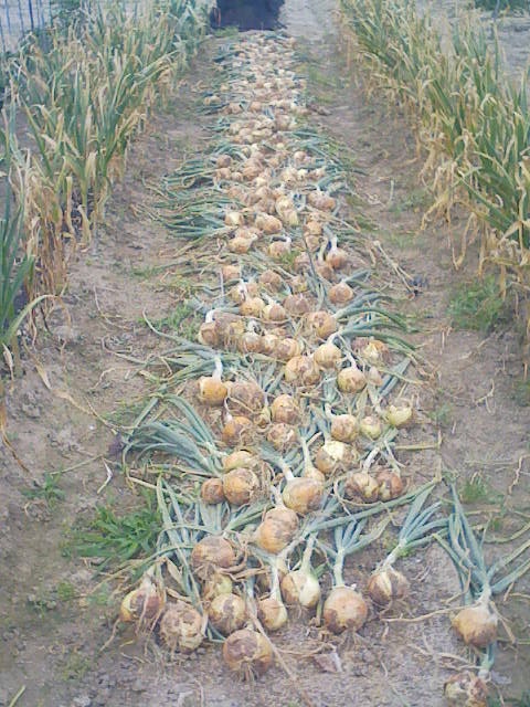3畝ある玉葱、9割方倒れてきたので全部収穫する事に玉葱を全て抜き、畑で乾燥させます今年の玉葱は、苗の発育が悪く菜園友に苗融通をお願いした所思いの他、多く集まり過ぎて・・・断る事も出来ないので、全~部植えてしまいました・第1畝・第2畝・第3畝全部で「900個」位あるかな今年は、結構大きな物が出来ました大玉は・・・掌が隠れてしまいました~家での消費は「200個」位少し余裕をみて「300個」位にしよう残り600個を、親戚・近所に配りまくります~明後日は予報明日中に片付けなくっちゃ・・・忙しくなりそう~ ほなぁ~