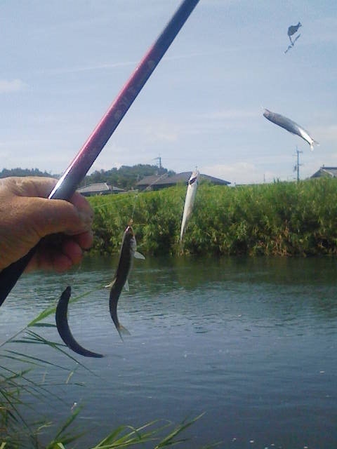 今日、釣り友Sさんと今シーズン初、稚鮎釣りに行って来ました朝4時半出発、現地まで約1時間琵琶湖に注ぐ「某川」昨年と同じ場所先ずは、川面を偵察・・・稚鮎が飛び跳ねている場所は、ここに決定6時から釣り開始最初から「入れ食い」5本針の仕掛けに・・・こんなのが(4匹)でも、平均的には・・・こんな感じ(2匹)午後1時、熱中症が怖いので早めに納竿報道では、今日は今年最高の暑さだったとか正解だったようです 釣果の方は、数は数え切れません重量で・・・3.8kg自家で全部消費は不可能お世話になっている「ご近所」に、半分以上をお裾分け大きなものは・・・15cm位ここらは、塩焼きが出来るかもそれ以外は、から揚げ・マリネ・甘露煮取り敢えず今夜は、「甘露煮」を作って貰いました夕食・・・これで一杯でした~ ほなぁ~