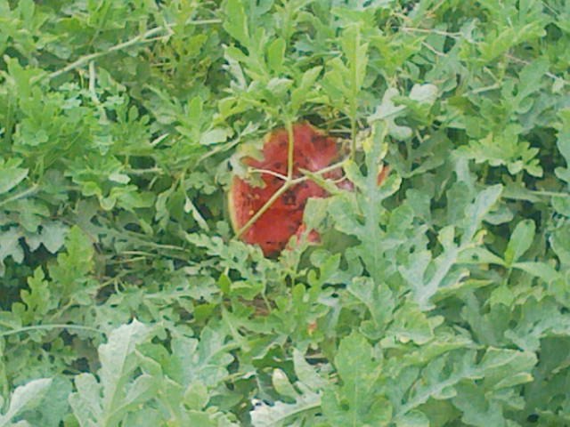 台風も去り、晴れ間も覗いてきました~気になる畑昨日、蔓受け・鳥除け等フェンス類は見回りしましたが被害は全く無し今日は、畑に入ってみましたまずは、雨に弱い「小玉西瓜」やっぱり・・・割れ腐り多発蔓に埋もれた中に・・・1個目2個目はフェンスの近くに、外から採り切ってみましたどこまで切っても・・・全部駄目3個目割れていたが、中はどうだろう残り:1/3位になっても・・・やはり駄目腐りの無い所を、1かけら食べてみました”甘~い”西瓜は、腐りかけの方がが甘いようだやはり”完熟”だね、でも収穫タイミングがね~結局今日の小玉西瓜収穫は・・・3個歩留まり・・・50%畑の小玉は・・・残り4個今度は、「100%」にするぞ~~ ほなぁ~