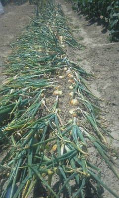 昨日、最後の玉葱を収穫しました今迄に、早生・中晩生は収穫済み晩生だけが残っていました(約400個)茎が全部倒れたので抜いて、半日日干し毎年の事だが、粒は揃わないですね~大きなの~小さなものまで今年の晩生は、大玉は少なめでした~晩生の保存方法を、淡路島方式にしてみます(半分の200個程)TVで見ました抜いたそのままを縛り、畑で保存です畑の雨除け屋根の下に、ハンガーを作りぶら下げます近くから見ると、こんな状態手間が掛からなくって楽ですよ~いつ頃まで持つかは分かりませんけど ほなぁ~