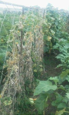 一昨日、一番手胡瓜の棚と蔓を片付けた一番手(手前)は葉が枯れてもう終焉二番手(奥) は未だ青々としている二番手、近くから見るとこんな状態もう少し頑張って貰えそうだこの程度が未だかなり残っているみたい取り合えづ今回は、一番手のみを撤収しました下には、お化け胡瓜がいっぱい空いたスペースは、秋野菜用三番手胡瓜は未だネットの中明日辺り、蔓受けネットを張ろうと思ってます二・三番の間、少し間が空きそう上手く繋げるって難しいですよね~ ほなぁ~