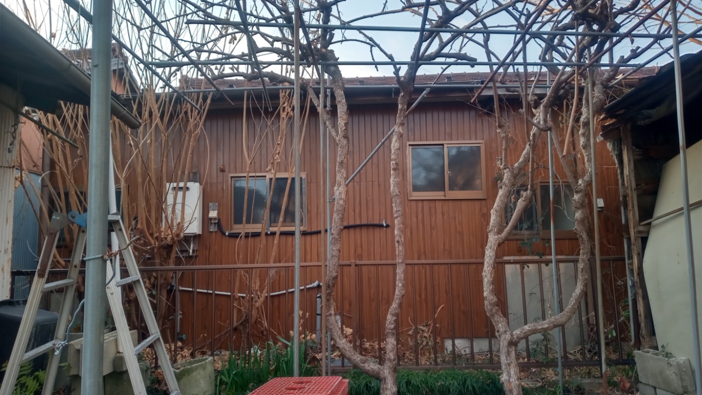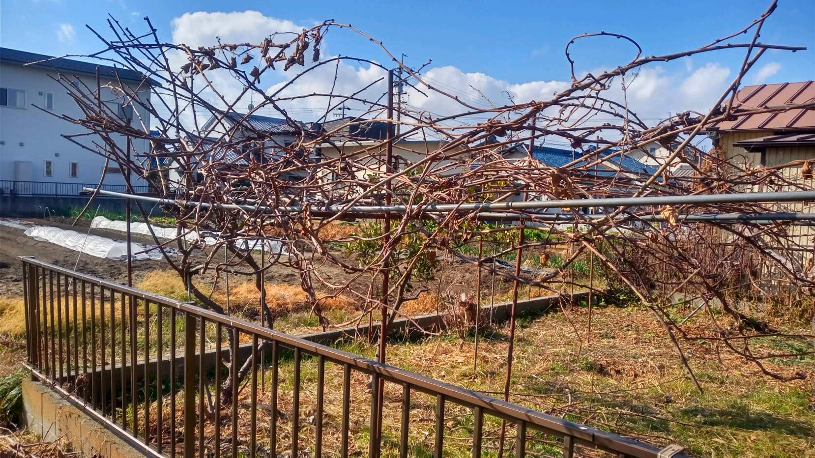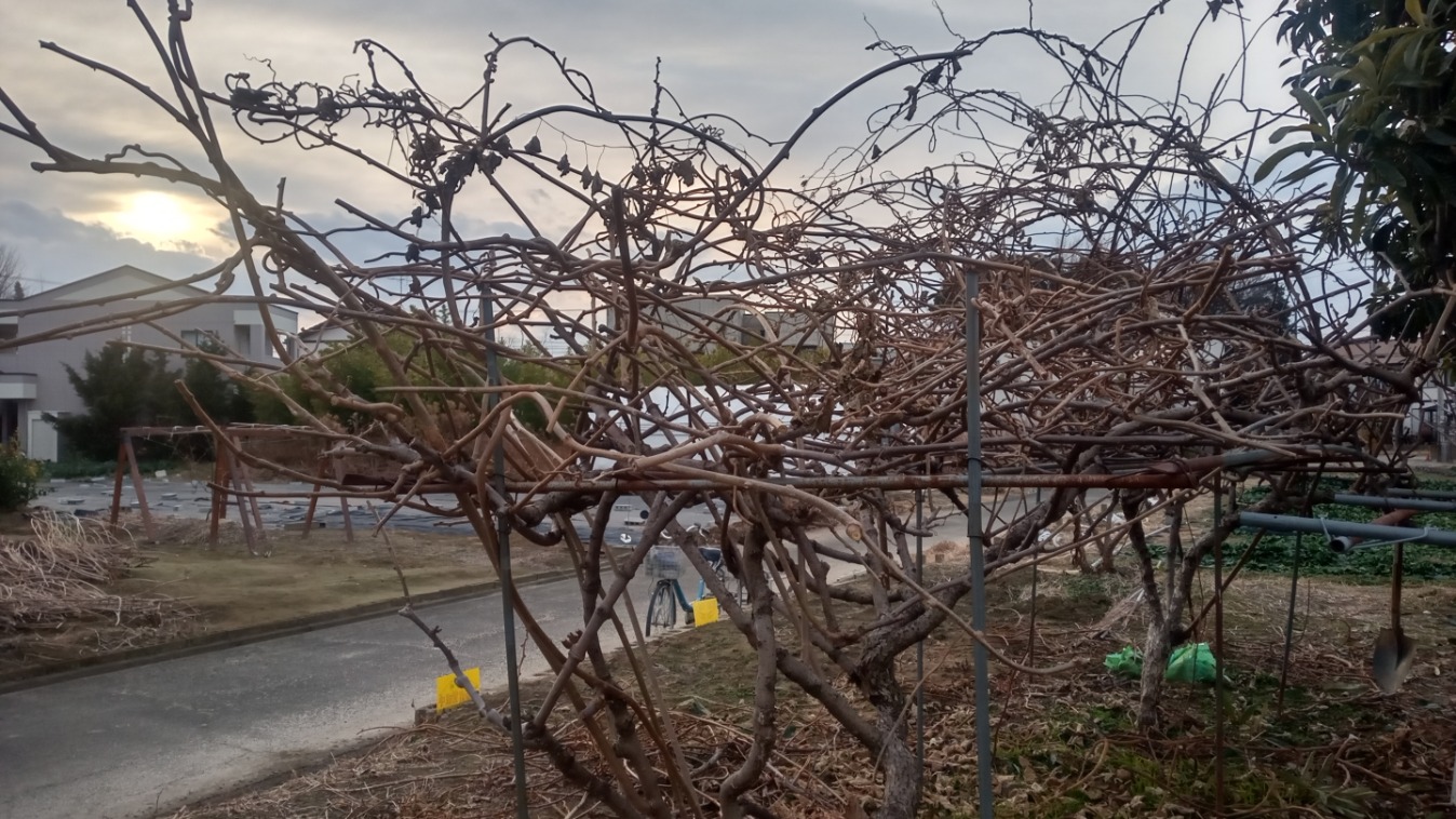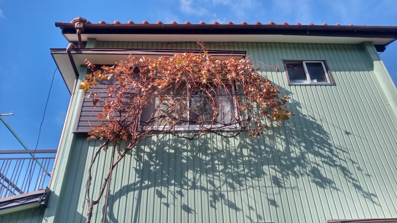 葡萄の葉が枯れて来ましたボツボツ剪定してもいい時期です建物の一部が2階になっていますガラス窓の日除け用に、葡萄の蔓を2階まで誘引しています季節になると葉が茂り、緑のカーテンにしています今はご覧の通り・・枯葉伸びた蔓を・・”カット”、剪定終了ですこれからの季節は、陽を取り入れます剪定屑です・・これから片付けします初夏になったら蔓も伸びて、夏には「緑のカーテン」で活躍してくれます昨年は異常気象で不作で3房だけ今年は頑張って欲しい、最低でも10房以上を期待 ほなぁ~