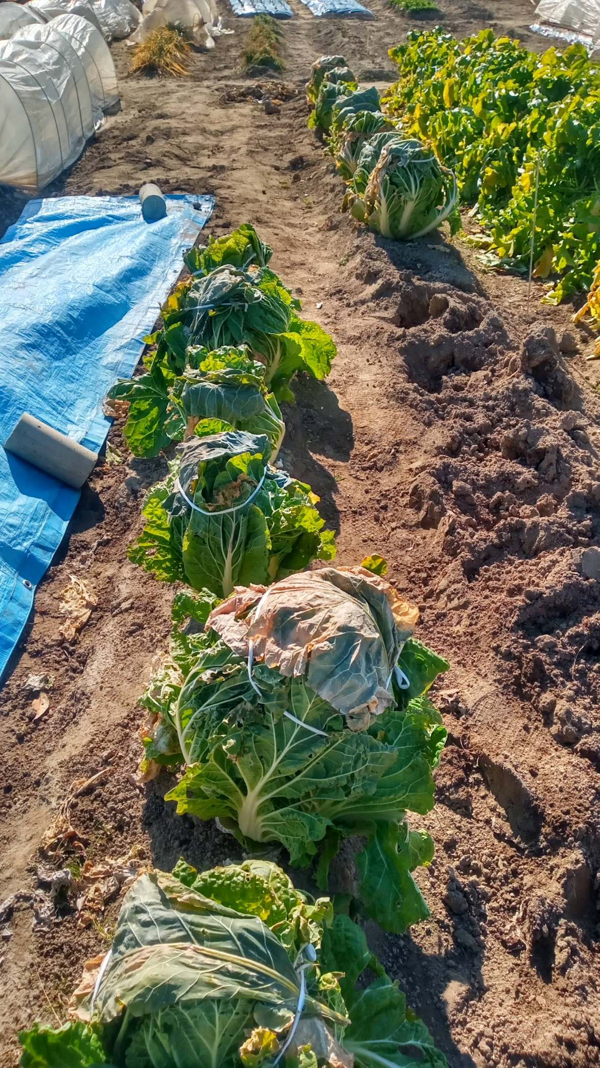この冬こちらでは霜は降りているが、雪は未だ降っていませんなので、未だ白菜に寒さ除けの鉢巻きをしていませんでした今年は止めようかと思っていたが、暇が出来たので昨年末に例年通り、霜・雪除けの鉢巻きを済ませました未だ、玉はしっかりしています紐で縛り、バラバラの葉を寄せ集めます更に頭の部分に、カリフラワーの葉を被せました未だ、10個以上残っている白菜全部に寒さ対策終了畝が大分汚れていますが、その後掃除しておきましたこれで雪がいつ降っても大丈夫 ほなぁ~
