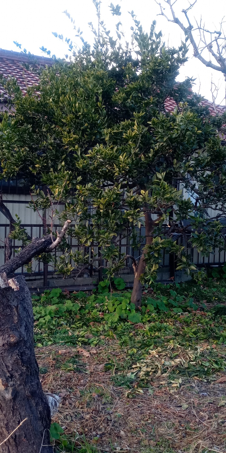 今朝、ミカンの樹剪定作業を終了しました一昨日から始め、暇な時少しずつ作業して来たら3日も掛かってしまいました今回は、背を低く枝の切り下げをします仕掛時の様子・・下の方を少し剪定上の方が大分徒長しています隣(借家)の屋根が、大分見えるようになりました今回の剪定屑ですこれで収量が増してくれると有難いのだが~ ほなぁ~