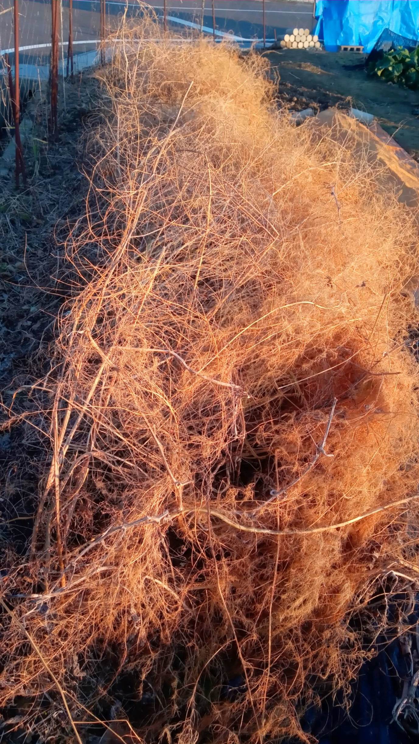 昨日、キウイ(ゴールド)の剪定をしました葉も落ちて、休眠状態に入っていますこれから2月に掛けて、剪定の適期です・剪定前の状態・・蔓が伸び放題です1株だけなので、直ぐ終わっちゃいました剪定屑です左の3束です、右の2束は少し前に済ませた温州ミカンの剪定屑です塵収拾のおじさんが扱えるサイズに縛り集積所出します今回はキウイ剪定の手始め、未だ果樹園に紅美人とヘイワードが残っています他にも枇杷が・・・暫く剪定作業が続きます ほなぁ~