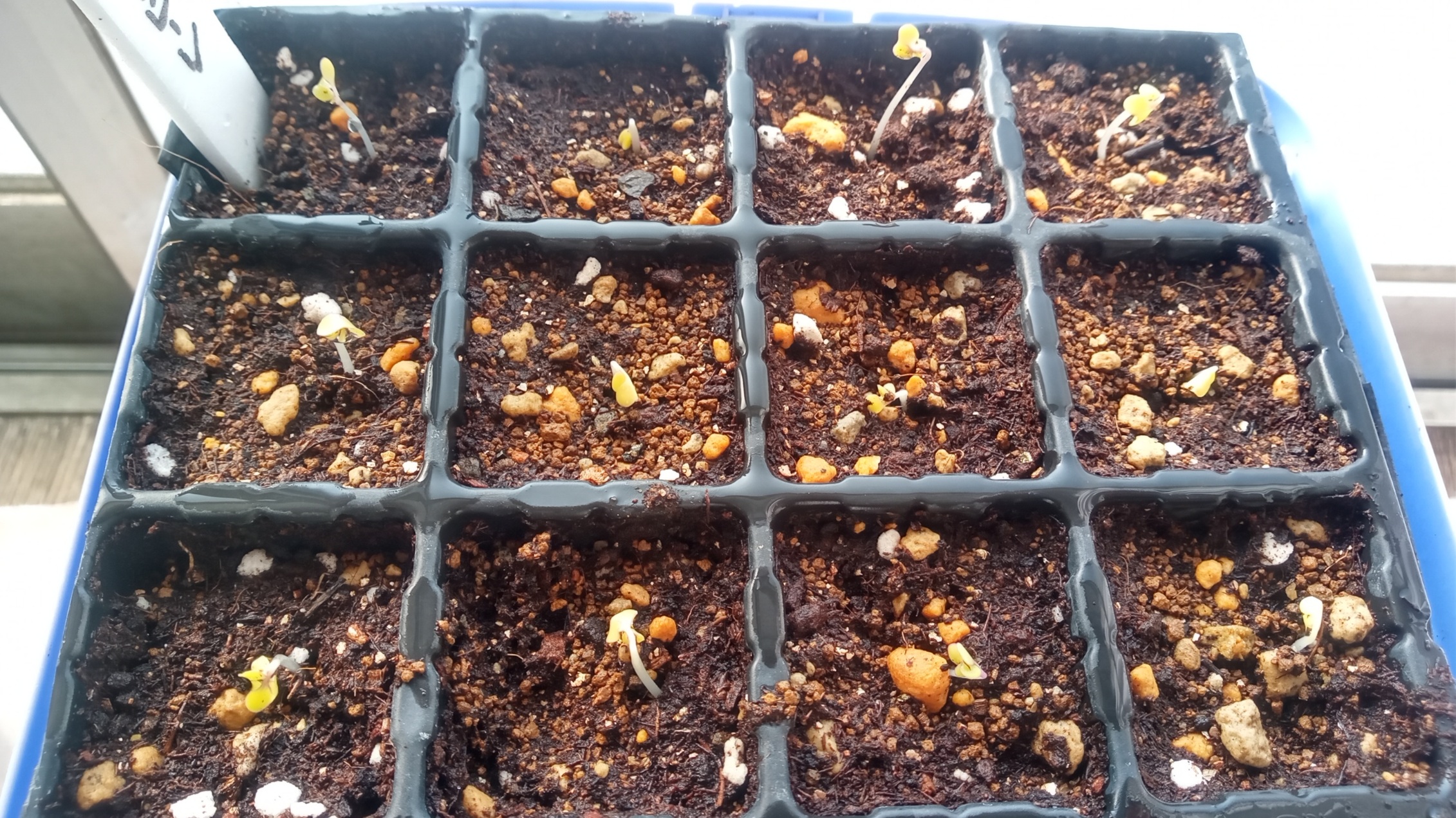 今朝発見しました今月10日に種蒔きしたカリフローレが発芽少し見辛いが、12粒の種が・・100%実は種蒔き2日後、芽出し器に移し、25℃に設定しておきましたその効果があったようですでも徒長しています今日から芽出し器から出して、温室で育てます夜はガラス戸1枚で外気と接するので、かなり冷えます多分徒長も治まるでしょう ほなぁ~