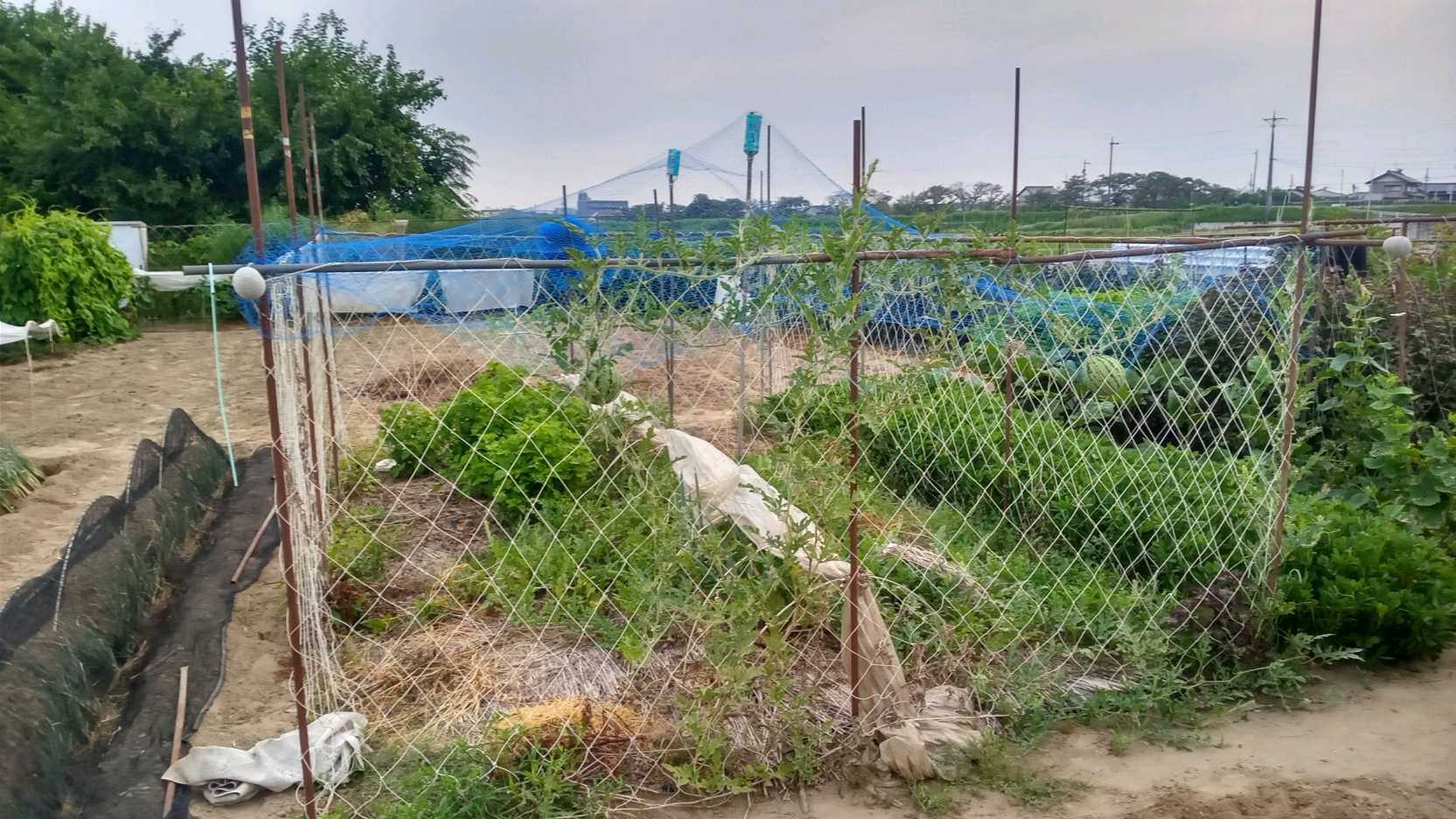 昨日、西瓜の畝を片付けしました・片付け前の状態 見えませんが、まだそのまま玉が残っています何とか食べれそうな物・・6個打音検査で駄目になった物です・・全て”ポイ”です海苔網は上に捲り上げ水平パイプに縛り付けました来年迄この状態です・片付け終わりました 西瓜・敷き藁etcを片付け、後日耕運機掛けします長さ5mの畝3本・・スペースが出来ました来年の鳥除け造りは簡単、紐を抜けば”海苔網が下がり”天井に網を被せるだけ・・1時間も掛からないでしょう ほなぁ~
