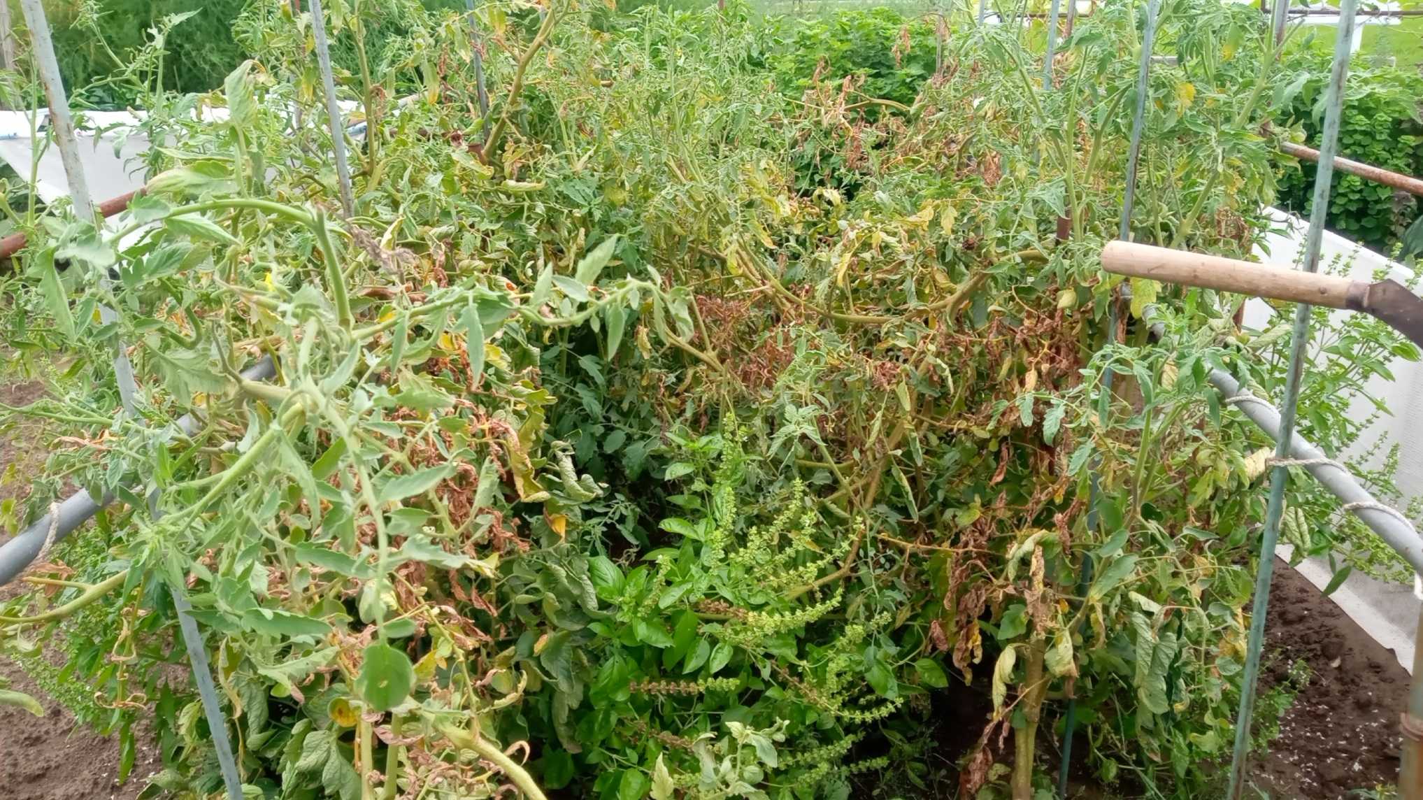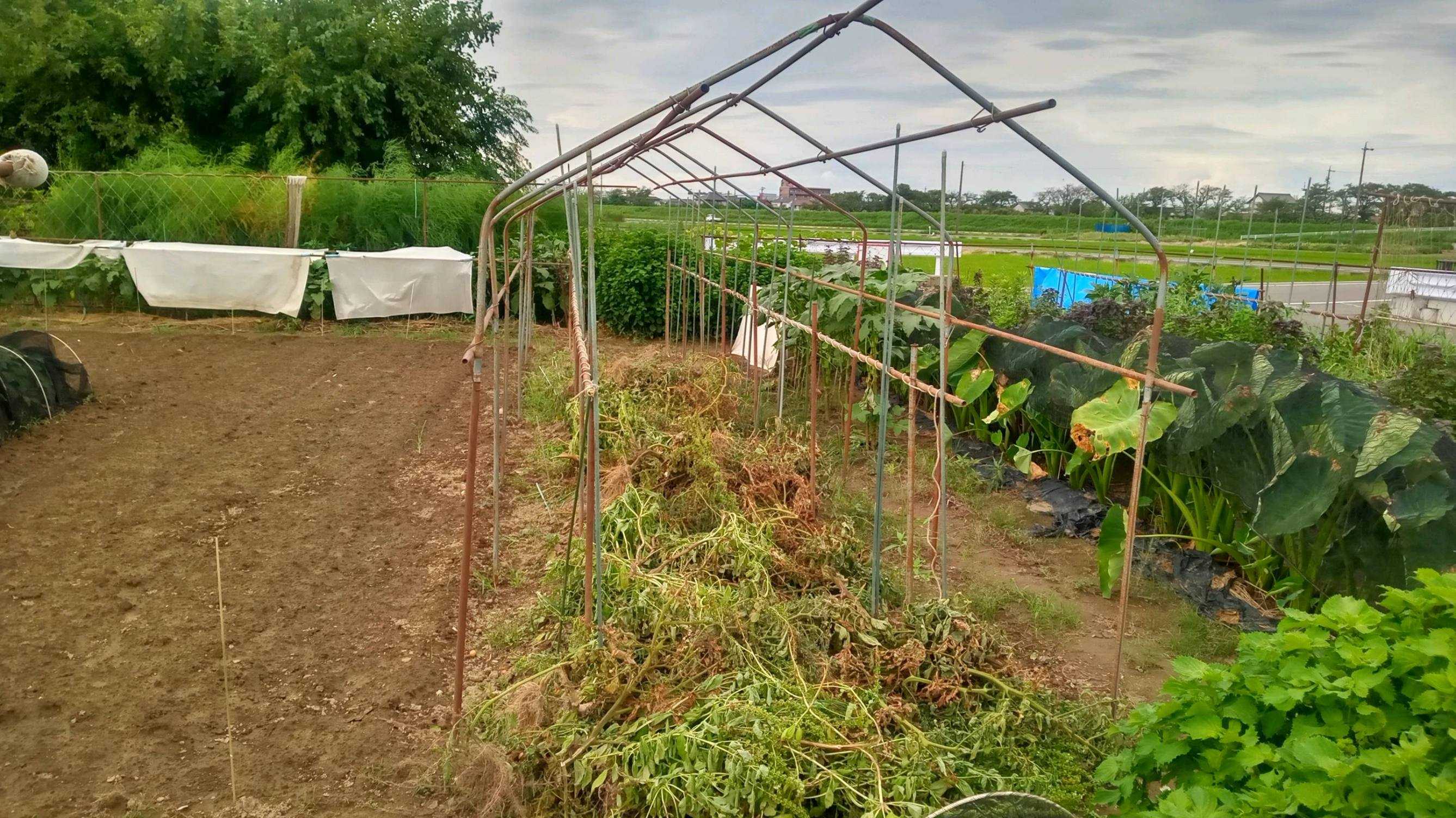 出来の悪かった今年のトマトもう果は生っていません、花も咲きませんでも樹は未だ枯れてはいません一緒に混植していたバジル・ニラも全部抜きましたもう屋根のビニールはトマトが生らなくなって直ぐ剥がしていたので3日間の雨でしっかり湿り、簡単に抜けました後は、骨組みの解体と、塵の片付けだけです塵が枯れる迄時間が掛かりそうです ほなぁ~