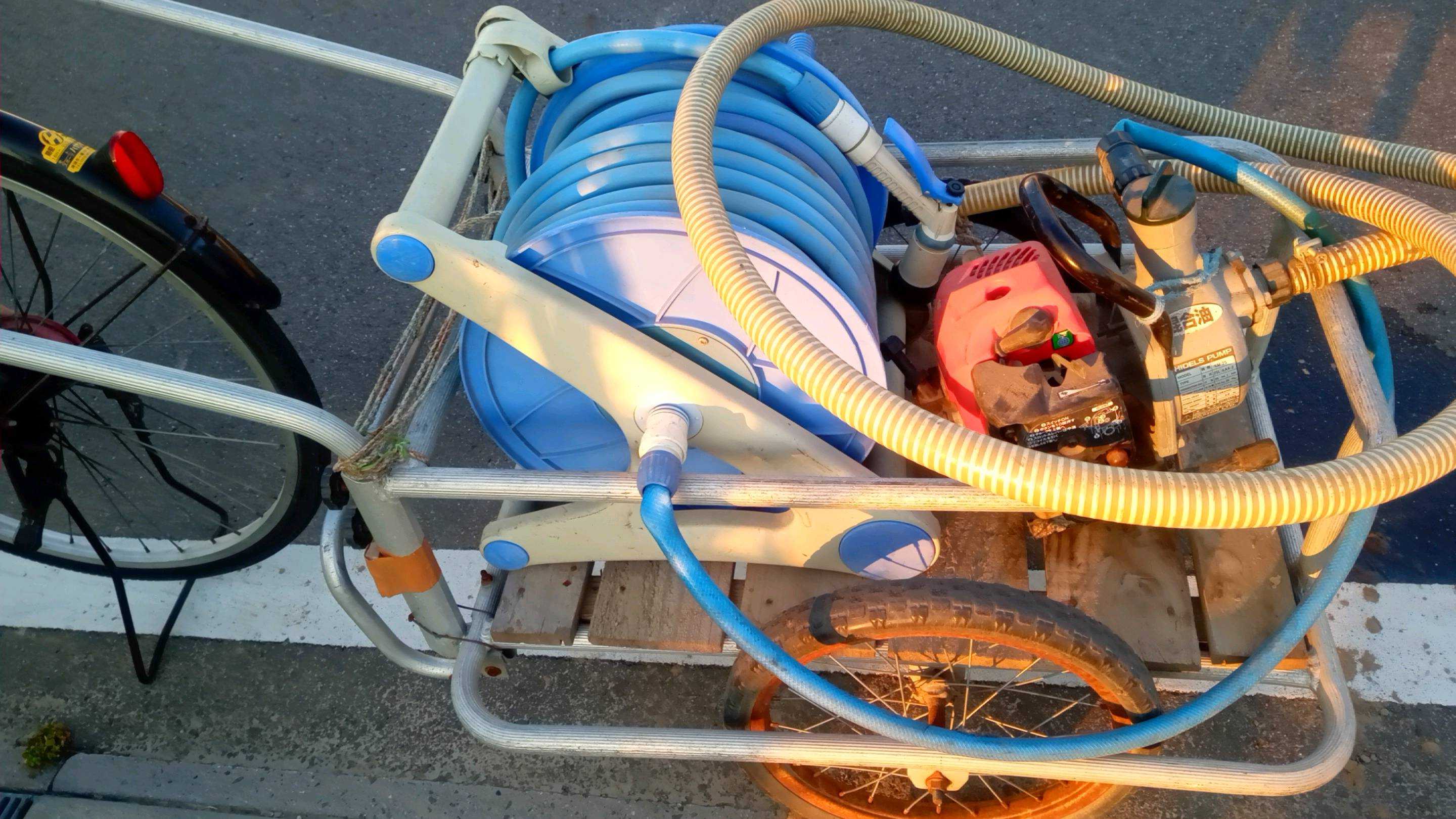 最近雨が降らなくて、畑の1㌧タンクが空になって来た今シーズン初めてのポンプ出動です畑は家から自転車で4分位の近場なので、毎回このスタイルですホースとポンプをリアカーに積んで畑まで運びます毎年の事ですが、隣畑の井戸をお借りしています今回は、40分でタンクがほぼ満タン近くになったので・・終了明日辺りから2日位雨が降るようなので、畑への散水は”パス”して溜まったタンクの水を今日はジョロで散水します予報が外れたら、明日にでも畑全体にポンプからホースを使って散水します ほなぁ~