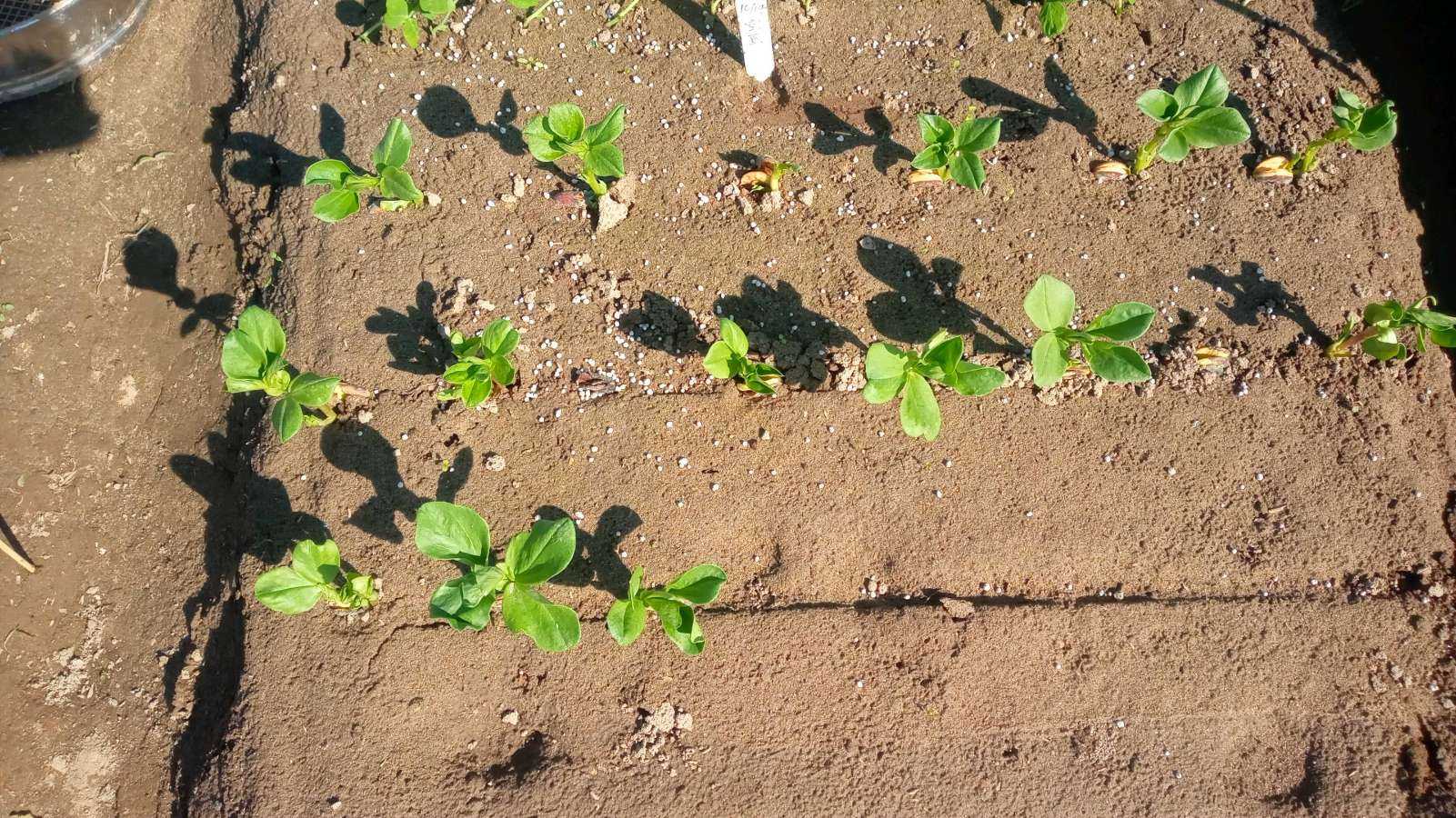 空豆・エンドウ(絹サヤ・スナップ)の苗を畑に定植しました育苗中の空豆です・・14株空豆植え付けしましたエンドウも・・1株に2本 左:空豆 右:エンドウ翌日雨予報だったので、株基に籾殻を撒いておきました おなぁ~