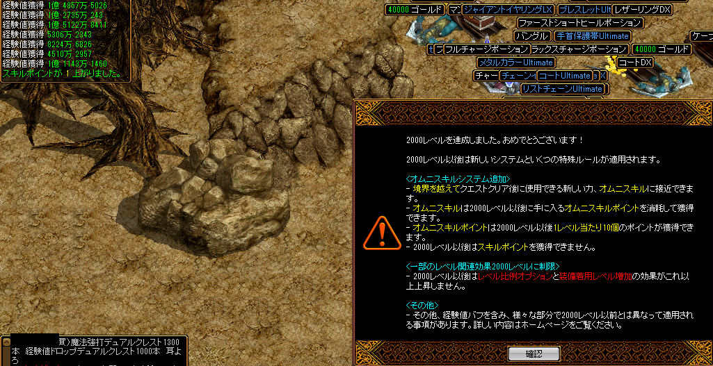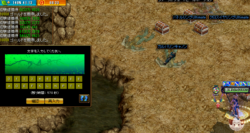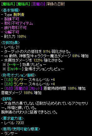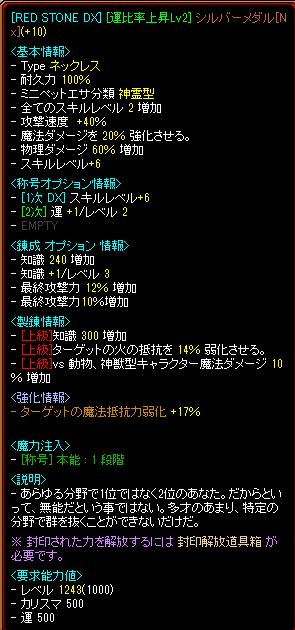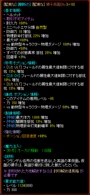 まず、被魔法吸収の効果がほとんど無くなるので↓を作成しました。※敢えて3穴で完全解放を使いました。2000狩場は動物型と悪魔型のMOBばかりなので、この獅子仮面は狩場に合った装備だと思います。(狩りしないんですけどね)OPについては、堅実なと剛断ので魔法抵抗の上限をUPさせないと、FBの入口に行く前にMOBに殺されてしまいます。全吸収&全回避して無傷で走り回れる時代は2000到達で終わったので、薬回復も重要になります。・クリーチャーパッシブ狩りはしないので上級経験値を削って、悪魔型・動物型ダメージを付けてみました。狩りしないのにダメージUPしても意味ないんだけどね!(笑)FBは、3つのマップのボスを順番に倒していくのですが、みんな移動が素早くて付いて行くのがすごく大変です。3つのマップ全てで報酬のアイテムをもらうのは、慣れないとけっこう難しいと感じました。(移動中に死ぬときもあるし、FBに殺されるときもあるし)今回は、これで終わりにします。また、次回の更新でお会いしましょう。