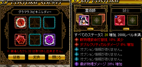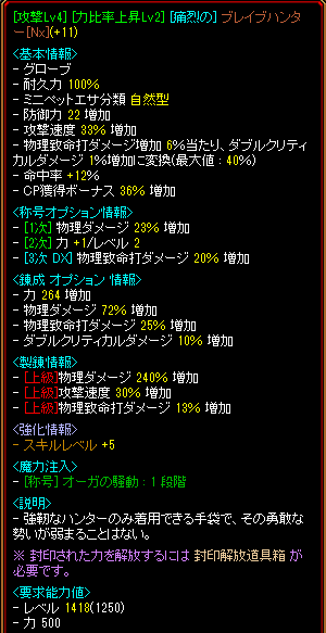 物理致命打ダメージを少し増やしました。物理致命打ダメージを13%増やしたので、(168+13)÷6=30 余り1これでダブクリ30%増加となりました。MAXの物理致命打ダメージ240%(ダブクリ40%)まであと59%です。ウポス補助の変換が成功すれば、ブレイブハンターの能力を最大限引き出せそうです。短いですが、今回はこれで終わりです。また、次回の更新で!