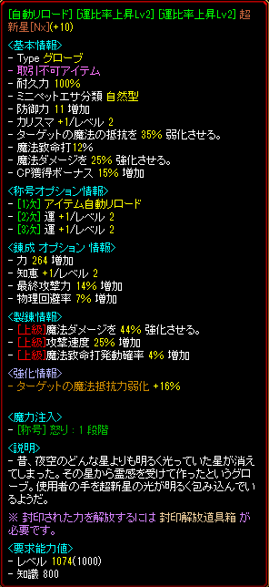 相変わらず無駄に色々な装備を作成しています。↑これは、Nx済で製錬10が60本だったので安いと思い買いました。OPは買ったときのままですが、4解放して変換してBFダブクリ付けて勇気注入は自分でやりました。次は、オバフロです。実は、今までオバフロは1回も使ったことがありませんでした。知識ランサーのクレセントが範囲が狭くて使いにくかったのでオバフロ買ってみました。知識ランサーだけでなく、メイドとキャノニアでも使います。3OP目は、薬回復のお守りが手に入ったら付けようと思っています。N達人が売れなくて、切れて自分で使うために加工しましたw混沌の再調整についてですが、玲瓏な混沌の破片が大量に手に入るようになった反面、ダメ・速度・RSが出にくくなっているように思います。今回も7回連続でCP効率と防御効率を引き続けて、ランプ3個も使わされてやっと速度を引きました。速度かダメが出たらさっさと終わろうと思っていたのですが、8回目にやっと引きました^^;↓は元から使っている達人です。ぶっちゃけ、T力比よりもWダメ力比の方が表記ダメは上がります。かなり多目にダメOPを積んでいる私の霊術でもT力比指よりもWダメ力比指の方が表記が高いので、大体誰でもそうなるんじゃないかと思います。無駄に異次元したり混沌の魔法書使うよりも、破片強化と再調整頑張った方がコスパ良いと思うんですけどねぇ。★おまけキャノニアさまぁ~位相兵寄生美味すぎますぅ~wwwwwLv1950までは寄生せずにソロ頑張ったけど、そこからは遠慮せず寄生しています・・w現在Lv1979です。早く霊術のレベル上げをしたいので、姫は寄生させてもらってサクっと終わらせたいですね!!では、今回はこれで終わりにします。また、次回の更新でお会いしましょう!
