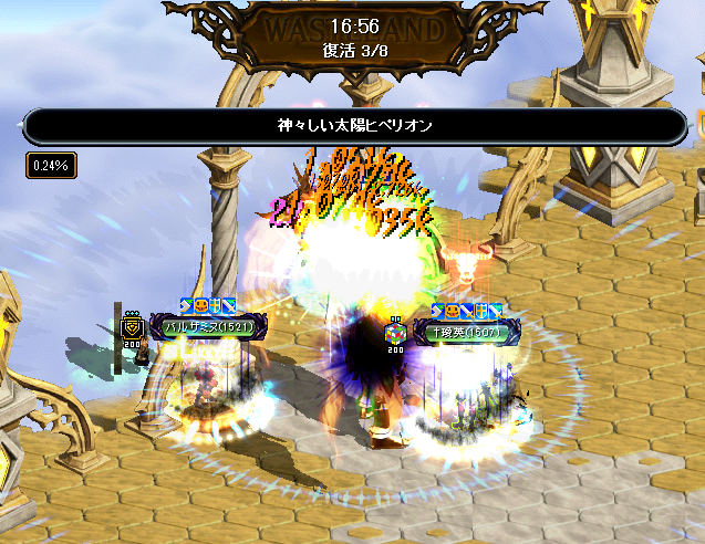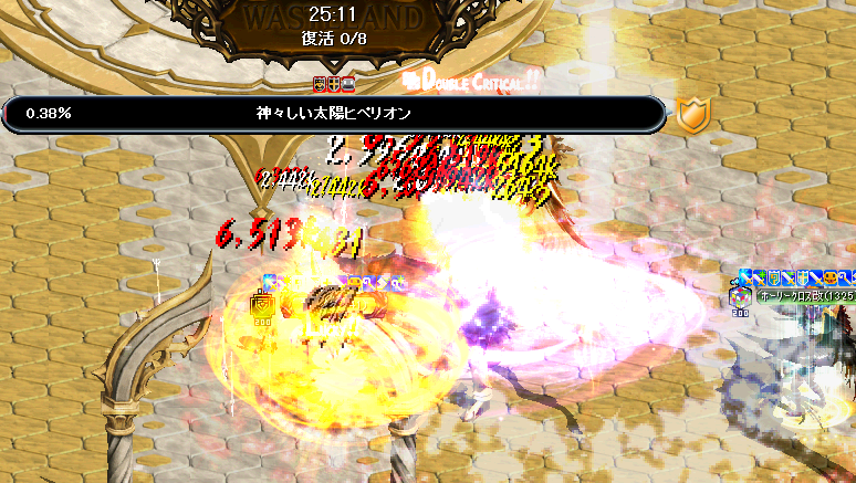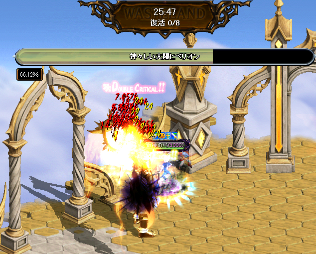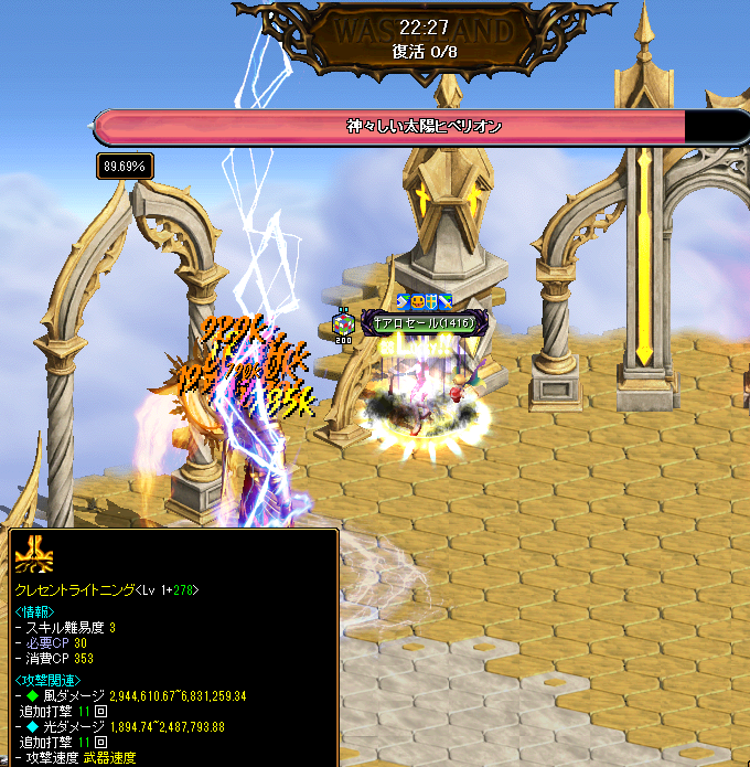 自分の天使とペアPTを組んでヒペリオンを倒せるか試してみました。まずヒペリオンのいるフィールドに飛ぶ前に、天使はホリクロ改でバリアを張ってからサンクしておいて、飛んだら前に進んでタゲを取ります。(最初に霊術がタゲられると、かなりの確率で即死して失敗になります)次にヒペリオンの攻撃の合間にサンクを解いてホリクロ改を撃って霊術にバリアを張ります。バリアがあれば霊術はなかなか死なない状態になるので、霊術が攻撃してタゲを取ります。霊術がヒペリオンをオートで殴って天使もオートでホリクロ連発する状態に持っていければ後は楽勝です。初手の位置取りやらサンクを解くタイミングを見計らったりで、霊術が攻撃できるまでに1分近く経過していたので、実質的には4分程度でヒペリオンを倒せるみたいです。(裏技のONとOFF切替えしてダメUPする!みたいなのは使っていません)ただ、ソロや2人PTのときより引率で4人PTを組んでいるときの方がヒペリオンの攻撃が痛いと思うのですが、実際のところどうなんですかね?メイドはソロや2人PTだと天使なしでも5分程度で普通にヒペリオンを倒せるのですが、4人PTのときに天使なしだとペチっていう音の攻撃1発で即死してしまうことがあります。(昨日は5~6分で倒せるって言っていたのに初手でペチっと死んで旗バフ切れて、更に何度か死んでクリアするのに15分も掛かってしまって本当にごめんね^^;)次回からは天使がいるときだけ引率するようにします^^;私には天使なし引率は早かったようですね・・w今週はメイドも霊術もクリアしてしまったので、来週からは霊術でも引率してみたいと思います。※天使がいるときだけだからね!今回はこれで終わりにします。また、次回で!