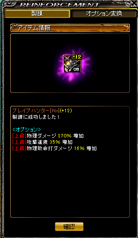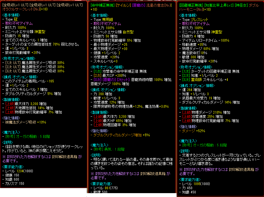 まず、Lv2000になったメインの物理槍から↓これを剥ぎ取って、霊術に移植しました。Lv2000になってしまうとレベル上げをしないので、ビスタがもったいないと常々思っていました。次に、手首は↓を作って満足していたのですが、敢えて新調してみました。1000UMUは、値段が下がったので異次元したい放題です!(4回失敗した)オーガがまだ4段ですが、他は大体完成しています。(勇気5箇所+オーガ2箇所)解放変換は、3OP目に最終ダメか武器最大攻撃力を引いて、他に有用なのを1つ2つ引けたらと思っていたので、今回の引きには満足しています。ここまで装備強化が進むと、レベル上げもやりたくなってしまいますよね。実は、今週末はボトル姫がMBの関係で倉庫Gに移籍しています。旗バフ無しで狩るのはもったいないので、とりあえず今週末のホットタイムは霊術で狩ろうかなと思っています。では、今回はこれで終わりにします。また、次回の更新でお会いしましょう。