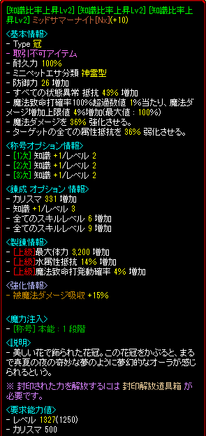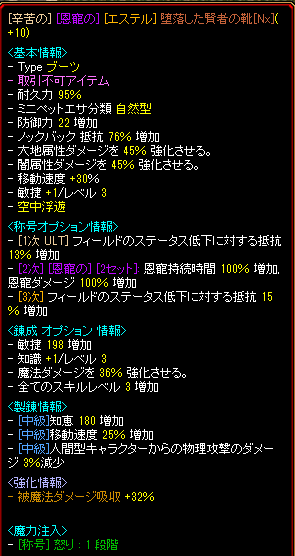 白異界で最強の堕落した賢者の靴を作ろうとしていたら、想定していない良OPを引いて困惑してしまいました。うーん・・要らないんだけど、消すのは惜しいんだよなぁ。というわけで、これを使う方法を数分考えました。そして閃いてしまいました!この前拾って全く売れないミッドサマーナイトという廃品を再利用しつつ、被魔法ダメージ吸収32%をも有効活用してしまう方法を!まず、クリーチャーパッシブを↑ここからスキルLv50を外しつつ最終ダメから上級経験値に少しシフトさせました。それで作った新しいパッシブが↓です。まだ1匹だけLRへの格上げと覚醒が終わっていないので被魔法ダメージ吸収がLv44ですが、これはLv50に上げることが可能です。あと、上級経験値もLv29までは上がります。(Lv29は悔しいので、後でSRで同じ組み合わせを厳選して、Lv31に上げられるようにするかも)このパッシブの改変により、魔法ダメージと魔法弱化が稼げるようになるので、マナに余裕ができたら魔法抵抗力低下Lv20を消して、もっと有用なパッシブに変更したいと考えています。次に、フェーズストーンを変更します。↓振るものがなくて運を上げたのですが、無駄に運7000台でした。というわけで、↓これが変更後のニュートラルストーンです。知恵以外に振るものがなかったのですが、今回は魔法属性ダメージ吸収が必要になったので40%取りました。そして最後に頭の変更です。これまで使っていた↓から、↓これに変更します。本当は、3解放して変換してから4解放にする予定だったのですが、完全解放3個目で4解放を引いてしまいました^^;後で資金的に余裕ができたら、4解放のまま解放変換するかも知れません。というわけで、装備やクリーチャーをいじくり回して被魔法ダメージを稼ぎましたが、これで本当に100%になったかというと・・BFOP32%+BFOP15%+クリーチャーパッシブ10%+ニュートラルストーン40%=97%だとwwwあ、あれ・・・100%になってないやんけ!!頭悪いんかよ!!!!と思われた方もいらっしゃるかと思いますが、ギルド石像が全ての属性で吸収3%か4%になっているので、実はこれで合計100%なんですよね。更にクリーチャーの格上げと覚醒が終わって被魔法ダメージ吸収がLv50に上がると、吸収は12%になります。ですから、石像が1%でも大丈夫なんですよね。(石像無しだとさすがに無理ですけど)というわけで、多大な手間とお金を費やして装備変更をしましたが、実際どのくらい強化されたのか結果を貼っておきますね。←これが変更前の表記ダメ こっちが変更後の表記ダメ→表記ダメは上がったので、一応成功したということにしておきましょう。(頑張って装備を変えたのに変化がなかったり、逆に少し弱くなったりすることもありますからね)今後は、4000マナのガチャもやらないといけないのでちょっと憂鬱ではありますが、これで狩り効率が少しでも上がって早くLv2000になれたらいいな~と思っております。ふう~SSたくさん貼ったので疲れましたwでは、また次回の更新でお会いしましょう。・おまけ魔法致命型ですが、ウトバウル湖のMOBに↑これくらいのダメージを与えられます。魔力注入を勇猛にすれば4万K出ると思いますが、メイドの装備をいくつか使っているので魔力注入は怒りを使わざるを得ません。