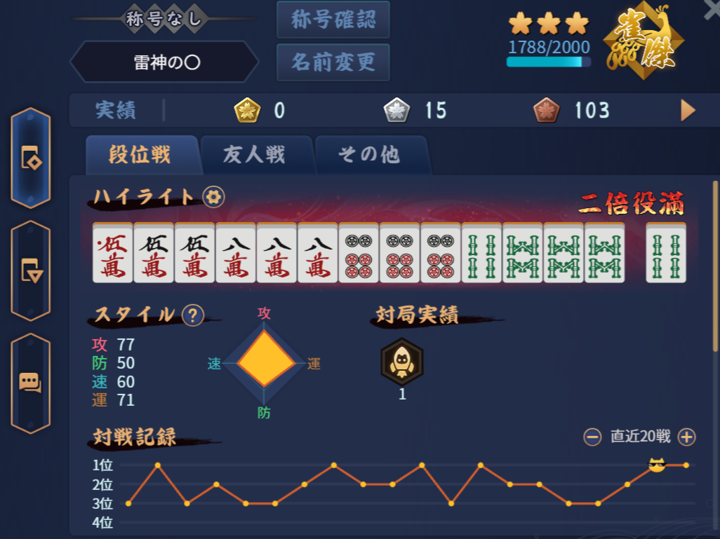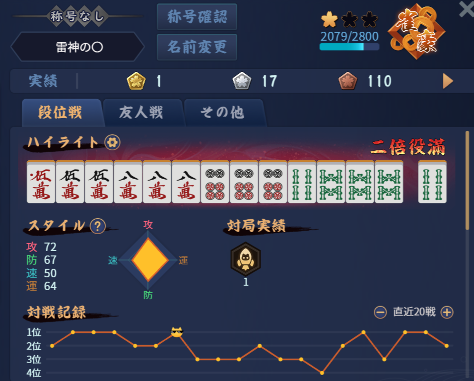 何とか雀豪になれました。けっこう時間掛かっちゃいましたね^^;前回の記事の直後は、ラスを何回か引いてしまって、けっこうポイントが下がってしまいました。そこから何とか立て直して、最後に3連勝して念願の雀豪になることができました。ちなみに段位戦285半荘目での到達でした。雀傑3になったのが147半荘目だったので、そこから運が悪くなければ200半荘以内で雀豪になれていたはずですよね。順調に勝てていた同じ金の間のはずなのに、なぜか雀傑3陥落寸前までボコボコにラス引きまくったのが悔やまれます。。(あの時の私、超絶クソ弱い奴でしたw)1000半荘超えると何回打ったか分からなくなる仕様なのかな?今日は疲れたので、麻雀は明日以降にやろうと思います。とりあえずRSのデイリークエでも回そうかな。それでは、また次回の更新で!★追記個人成績を↓にスクロールさせたら、対戦数だけでなく細かいデータまで出ていました・・w1位率が30%は欲しいところですなぁ。(あと放銃率がけっこう高いところもダメダメですわ)金の間での戦績がこの程度で、玉の間の強い人たちと戦えるのか分かりませんが、明日以降頑張りますねw