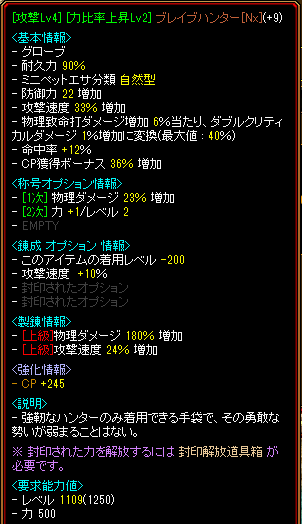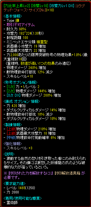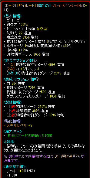 あとでSP製錬ガードを買って+12にするかも知れませんが、これで大体完成しました。ブレイブハンターを使う場合、物理致命打ダメージを稼がないと意味がありません。手だけで98%稼げていますが、その他がどうなっているかというと、クリーチャーパッシブで70%稼いでいます。手98%+パッシブ70%=168%168÷6=28 ということで、今のところダブクリ28%が加算されています。最大はダブクリ40%なので、物理致命打ダメージを240%まで上げたいところです。ウポス補助に物理致命打ダメージを付けられたら240%付近までいけそうなので、現在ウポス補助を作り直しています。(新しく買った補助武器をレベル15まで上げて、変換を頑張っています)今回はこれで終わりにします。また、次回の更新でお会いしましょう。