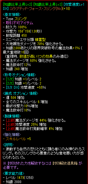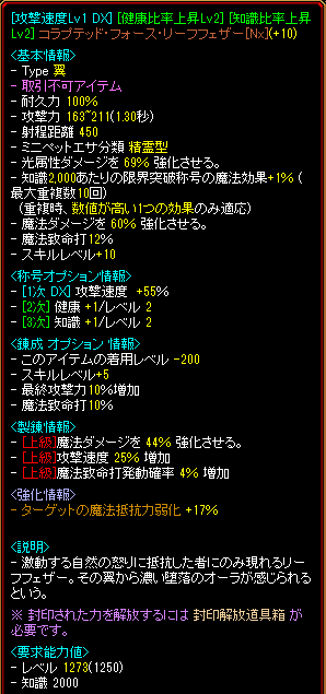 姫のボトル束洗礼というスキルは、範囲5段スキルです。段数が少ないので、全段カンストの40000Kにしても1パン狩りができません。※カイグラン・ウトバウル湖での話ですというわけで、どんなに与ダメを増やしたところで姫は2パン狩りになってしまいます。ですから、ある程度ダメージソースが稼げるようになったら、2パンを維持しつつ知恵振りをした方がレベル上げの効率が上がります。クリーチャーも最終ダメを削って経験値を増やしました。※上級大地強化は覚醒でLv20まで上げられます。前回の記事にあったように、頭で知識やスキルを稼げるようになったので、知恵を大幅に増やしてみました。経験値ボーナスが+70%になるところまで振ってみました。これによりボトル束の表記は↓になりました。かなり表記が下がりましたが、カイグラン深部での実ダメは27000K前後です。これでも確定2パン狩りが可能なので、知恵を増やした方が効率は確実に上がります。というよりむしろ経験値を増やすことでしか効率を上げられません。位相兵を異常な高火力で広範囲狩りをするキャノニアの効率に比べると悲しくなりますが、Lv2000目指してコツコツやっていきたいと思います。・おまけ前回の記事で、製錬が終わってないのに完成品として載せちゃったので、この記事で製錬も終わった画像を載せておきます。狩場によってはリフレクも良いなって思っているので、そのうちリフレクも作るかも知れません。では、今回はこれで終わりにします。また、次回の更新でお会いしましょう。