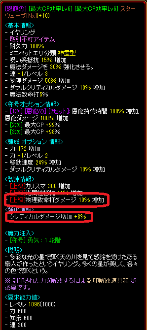 ・武器姫は攻撃速度が重要なので速度DXを付けています。製錬を上げたり、オニトルロを付けたりは金がないのでやりません。・耳ボトル束洗礼は範囲が広いのでオーバーフローは必要ありません。製錬は、自前のガードが必要なので、なかなか+10に上げられません。※追記 記事更新後に、CP効率⇒HP効率に変更しました。・足この足を使うために姫を作ったので、マナウォーカーがどれだけ安くなってもこれを使い続けます。BFOPは白異界で頑張っていますが、必要ない良OPを引いたり苦戦中・・。・頭内部的に魔法ダメ100%を加算してくれる魔法致命型では必須の頭です。・鎧魔法限界を付けたので、1000職鎧に無理に変更しなくていいかなと思っています。・首W最終ダメになっていませんが、他OPもまあまあ優秀なのでこれでいいかなと思っています。・手狩り用なら、これで十分です。・補助武器魔法致命型としては最良のOP構成です。これ1つで属性弱化が上限に届くのは非常に楽です。・腰メインIDと腰のやり取りをするのが面倒だったので、箱からこれを選択して使っています。製錬は、自前のガードがなかなか手に入らないので+9で我慢しています。・コス&クレストサブIDのキャラにしては、クレスト頑張ってると思いませんか?・クリーチャー3パッシブのクリーチャーを1匹作成したので、上級経験値が中途半端なレベルになっています。ちなみに図鑑は113匹登録済で、未登録なのはアビス以外のLR4匹とGR3匹だけです。・超越スキル恩寵ダメが強くなったので闇から大地に変更しました。そのため超越スキルも暴走から魔力吸収に変更しています。私は、暴走より覚醒派です。・ミニP長寿ヌウリ(自作)と最近購入した変異土Pです。変異土Pは、表記には反映されないものの土攻撃を上限超えて強化してくれます。・ステ&装備外観こんな感じのステでヤティカヌ暁を狩っています。指は載せるの大変なので、OPはご想像にお任せです。(ちなNxできる指は全部4解放)・表記ここに魔法ダメ100%と大地ダメ56%が内部的に上乗せされているはずです。・ヤティカヌ暁での実ダメ黄色で囲ったのが”怒り”の謎追加黄ダメです。青と赤で囲ったのは、抵抗の低いジャガー系に与えたダメです。3万K前後出ているので、べつに強打型にしなくてもいいよね。というか、強打型にしたとしても、どうしたって表記が致命型に比べて低くなるのと、強打率が100%になるわけではないので、そこまで狩り効率に差が出ないというのが私の見解です。★弱化強化メモ・魔法強化武器104%頭36%腰25%+BFOP55%手81%足36%皆既日食40%永遠指5%知識集中75%MB6%クリーチャー50%錬金20%合計513%+錬金20%・魔法弱化手49%首16%(BFOP)皆既日食20%腰30%クリーチャー10%合計125%・大地強化武器70%補助武器160%足45%指20%クレスト130%クリーチャー42%合計467%・大地弱化頭36%補助武器120%合計156%・最終ダメ武器10%首12%永遠指5%ファルコン指3%超越『覚醒』特殊強化5%クリーチャー7%ブラックファイアー討伐バッジ3%グレートマウンテン討伐バッジ6%MB3%合計54%・魔法致命打率頭14%手18%腰20%武器26%補助武器20%指4%クリーチャー25%合計127%