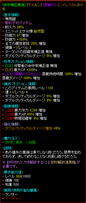 ↓これが元の状態です。まず、カイグラン深部で被弾が多いので、恩寵の→回避DXに変更しました。(恩寵のは、足に持っていきました)さらに、解放OPはそのままでも割と良いのですが、敢えて変換チャレンジしてみました。元の解放OPを少し良くした感じになりました。(この程度の変化に1200本使う価値があったかは分からないですが^^;)解放変換は、引きが良ければ神装備になる可能性があるので、ついやっちゃうんですよね。力比1/2+ダブクリ+限界ダメとかそんな感じの複合を引かないかな~って毎回期待するんですが、もちろんそんなのは何百回やったところで出るわけないのは分かっていますwでも、宝くじを買うときのような楽しさがあって、ついつい散財してしまうんですよね。まぁ、今回もお金は吹き飛びましたが、一応装備強化できたので良しとします。今日2レベルUPしたので、Lv2000まであと23レベルですが、まだまだ長時間狩りをしないといけないので、少しでも効率が上がればと思って装備更新をしました。では、また次回の更新でお会いしましょう。