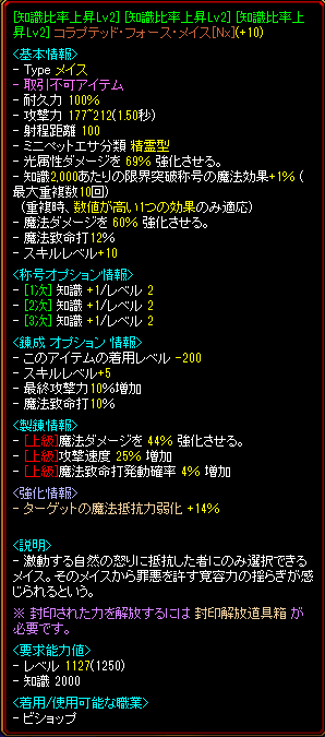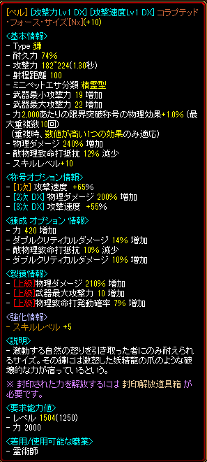 今年の金鯖で作った唯一のキャラですが、一応育成することに決めました。大体の装備は、メイドから転用しています。武器だけは各職固有なので、↓を使っています。ベースの火強化・光強化は30~35(だよね?)の補正があります。昔の私なら両方35を引くまで粘ったかも知れませんが、今の私はそれなりの数値で妥協するスタイルに変わっています。ふいごも錬成材も高いので、そう何度もやってられませんからねwデイリーとウィークリーはなるべくやるけど、狩りはあまりやらないと思うので、Lv1500になるのは何ヵ月後になるか分かりません。それでも、新キャラの装備とかクリーチャーの組み合わせを考えるのは楽しいので、作って正解だったと思っています。・おまけ天使のときに拾いたかったよねwBISコラプ買ってから出てもねぇ・・・でも売っても安いし、位相のときは天使なので、自分で使おうかな。では、今回はこれで終わりにします。また、次回の更新でお会いしましょう。