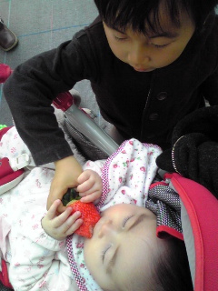 昨日 幼稚園のママ友の4家族総勢17名でいちご狩りに行ってきました。 もちろんさこサンも行きましたよー。お兄ちゃんからアムアム食べさせてもらってました♪ 美味しかったなぁ。また来年も絶対行きたい! 昨年同様 私 誰よりも食べてたと思います。元はとらないと! と意気込んでがっついてきました。 でも・・・うちのダンナ様ったら・・・ 「オレ 5粒しか 食わへんだ。」なーんて言うんですよ~! 5粒~?!ごちゅぶ~!?アンタそれじゃひと粒320円やないの!私スーパーならひとパック398円でも迷うのに~!もう!! いちご狩り失格ー!って そこまで怒ってへんけど・・・。 ファミリー単位じゃ損した気分。でもま美味しかったし楽しかったからいっか